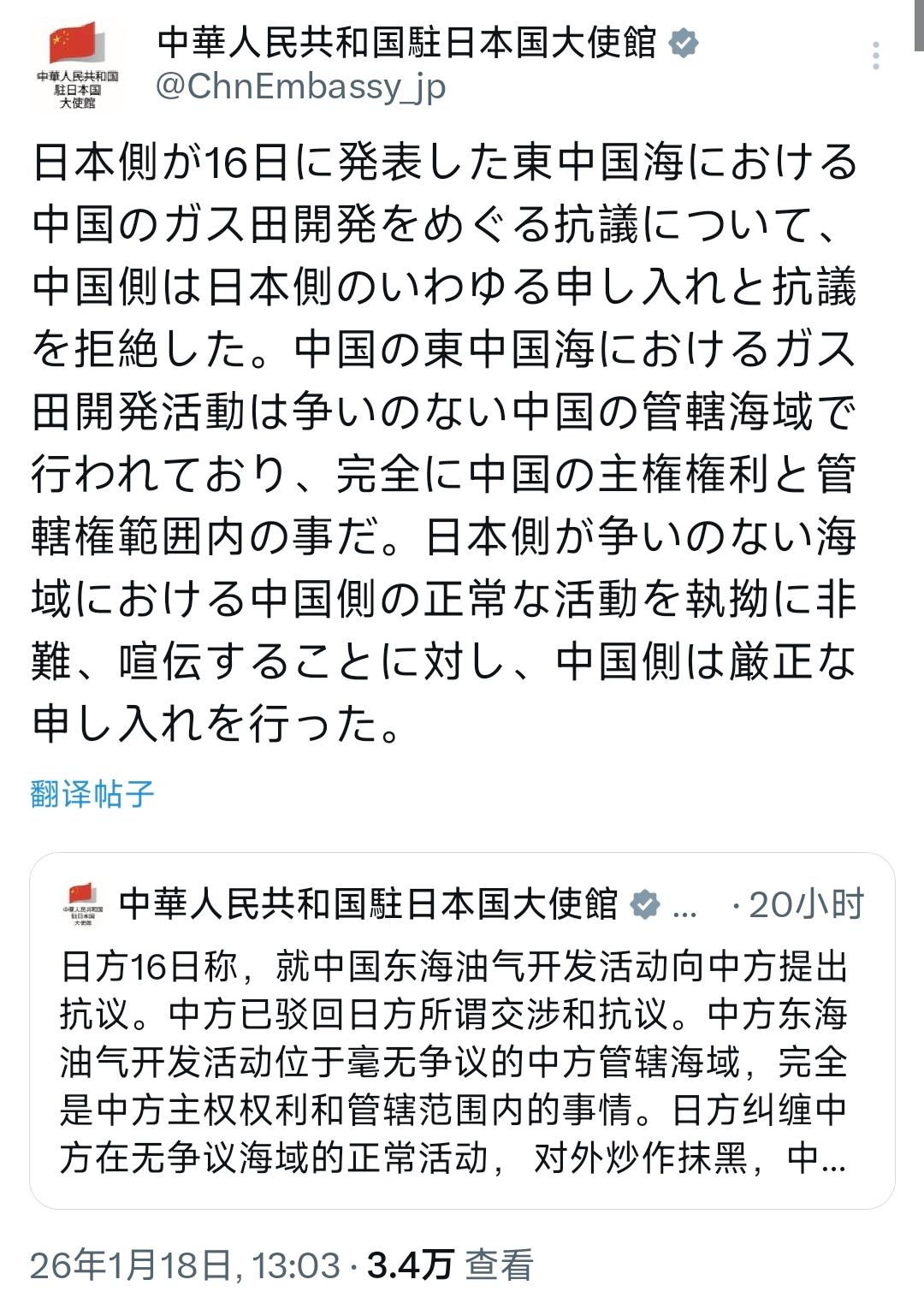 针对日方的抗议,中国驻日本大使馆1月18日用中日文写道:“日方16日称,就中国东海油气开发活动向中方提出抗议。中方已驳回日方所谓交涉和抗议。中方东海油气开发活动位于毫无争议的中方管辖海域,完全是中方主权权利和管辖范围内的事情。日方纠缠中方在无争议海域的正常活动, 对外炒作抹黑,中方已向日方提出严正交涉。” [机智]评几句:日方还不知道自己已经被挂上了“斩杀线”。日方就东海油气开发的抗议纯属自导自演的政治闹剧,其单方面炮制的“中间线”本就无国际法支撑,却对中方在自家管辖海域的正当活动指手画脚。中国驻日使馆的严正驳回,已是仁至义尽的底线告知,可日方仍沉溺于“抗议碰瓷”的虚妄中,丝毫未察自身已站在危险的“斩杀线”上。中方主权范围内的开发不容置喙,日方若继续炒作抹黑、触碰红线,终将为自己的战略误判付出沉重代价。
