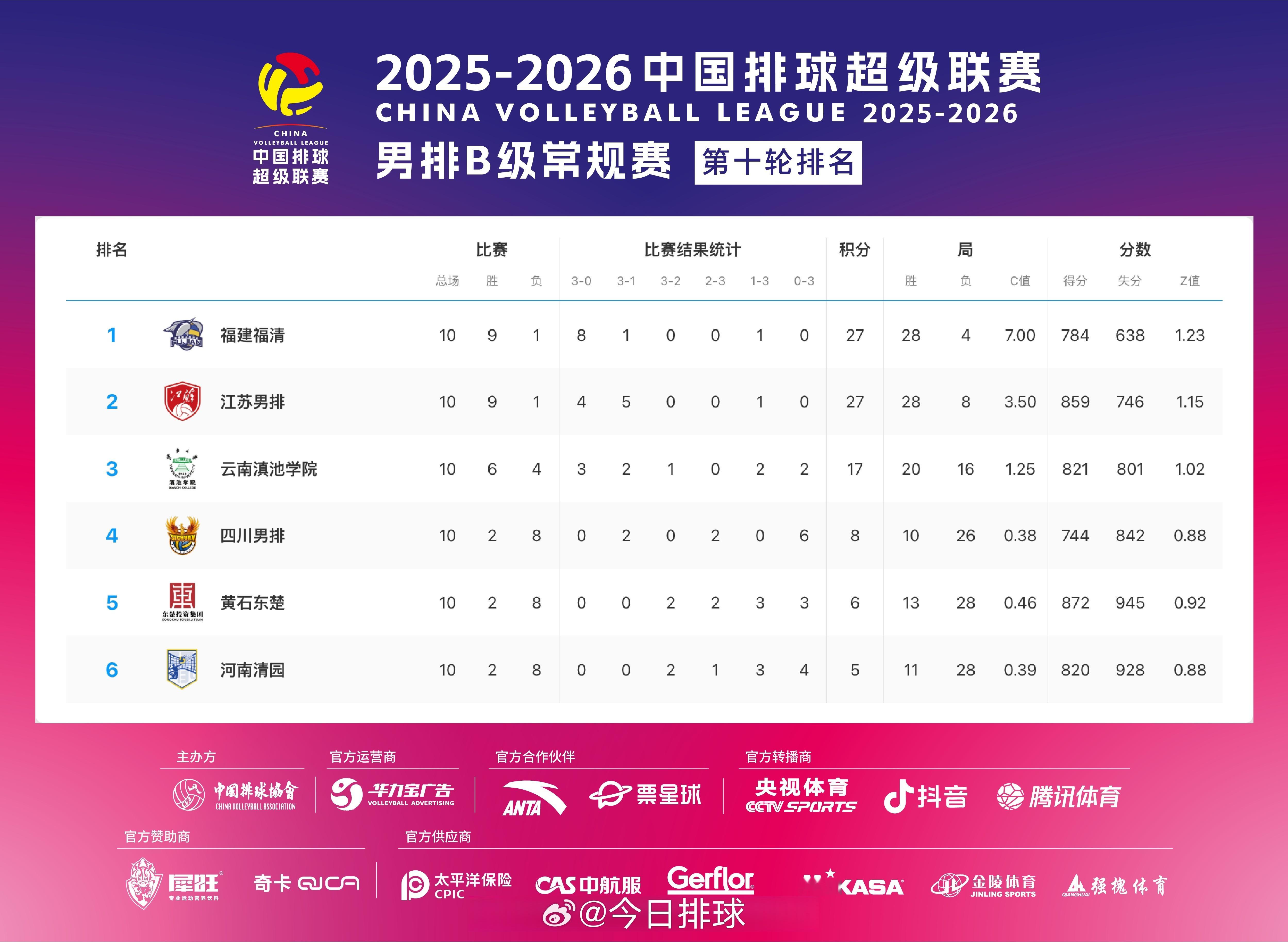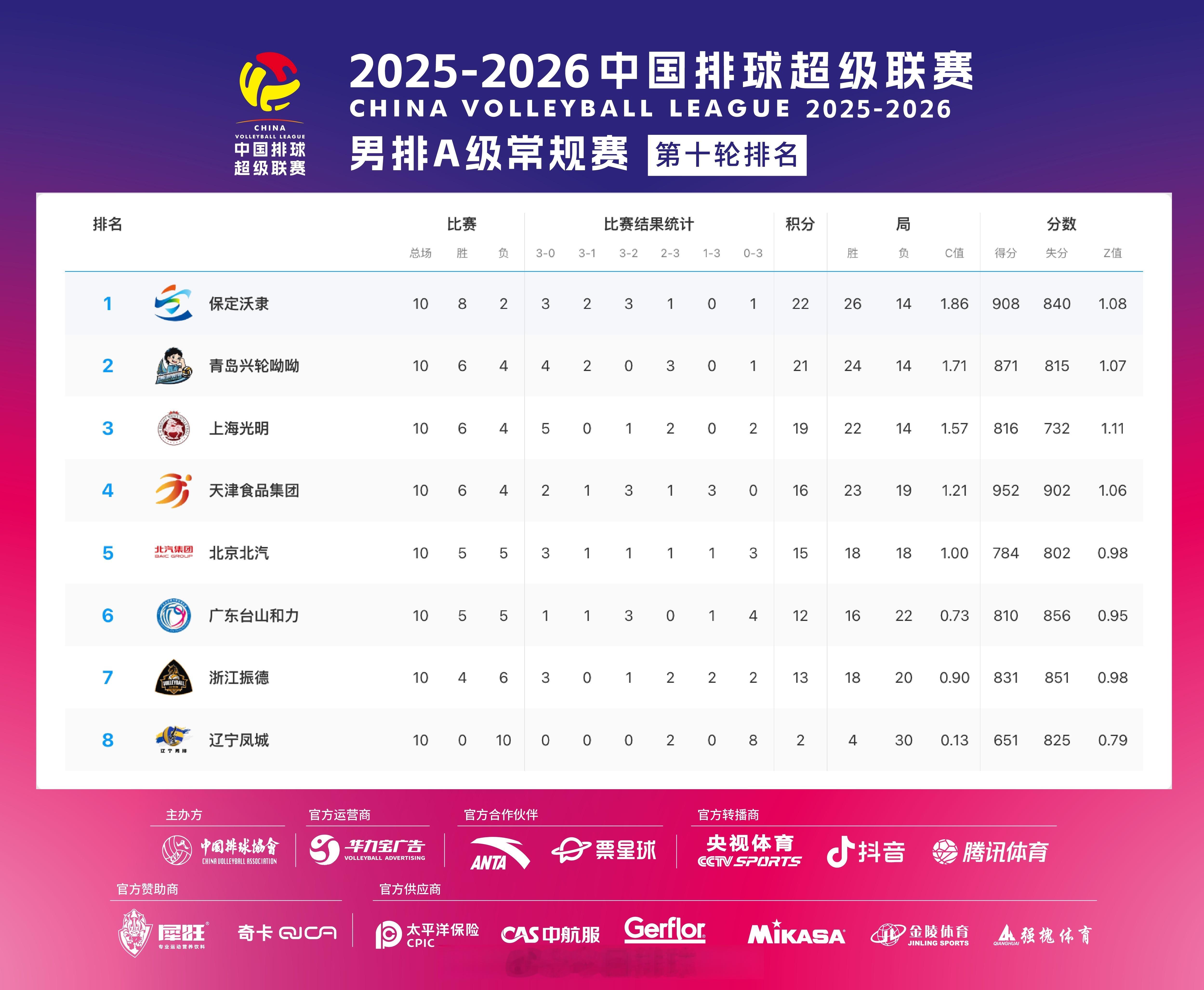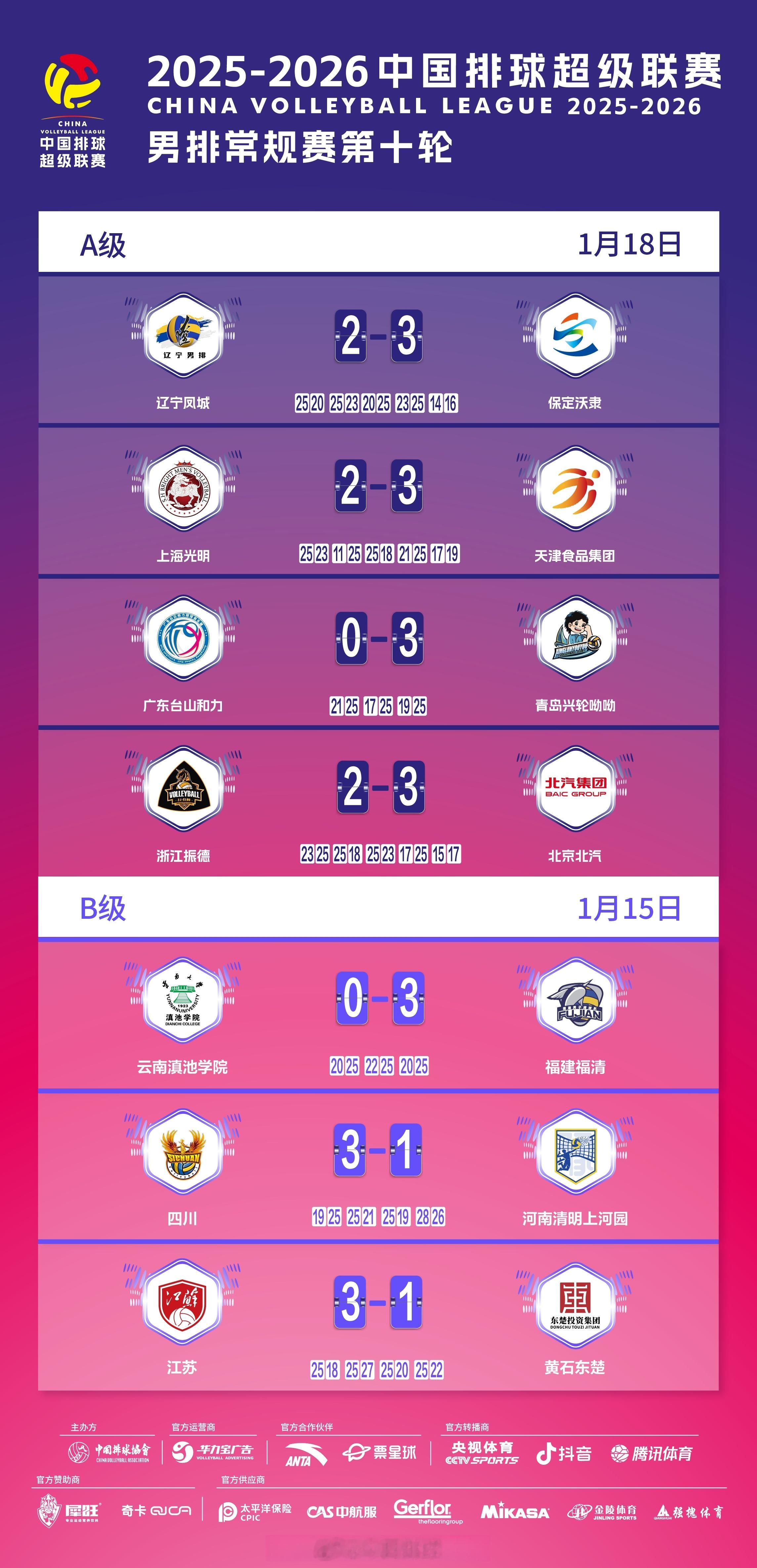 2025-2026中国男排超级联赛 A级和B级常规赛第10轮比赛结果,及该轮过后参赛队的积分排名。