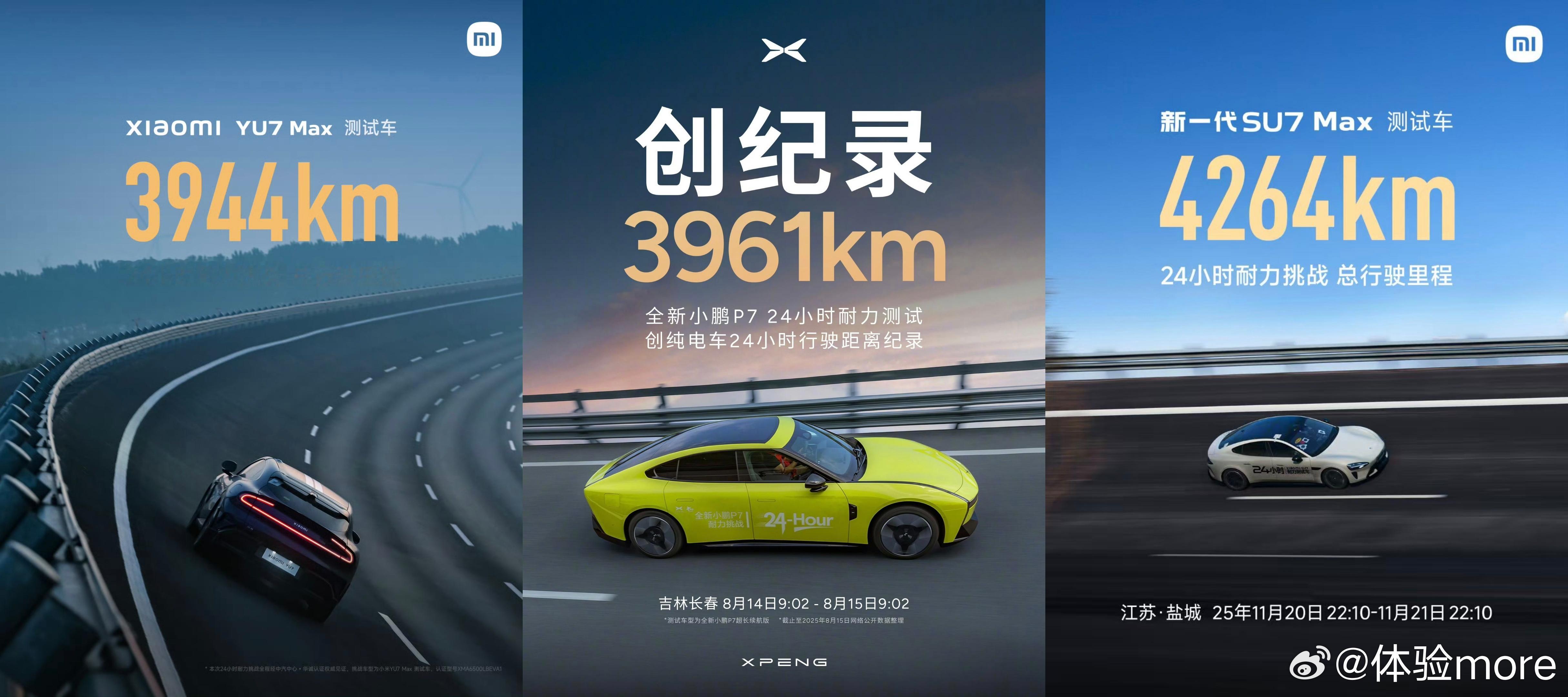 新一代SU7 Max,24小时耐力挑战总行驶里程4264km,量产纯电车的新纪录。小米YU7 Max是3944km全新小鹏P7超长续航版是3961km奔驰AMG GT XX概念车是5479km