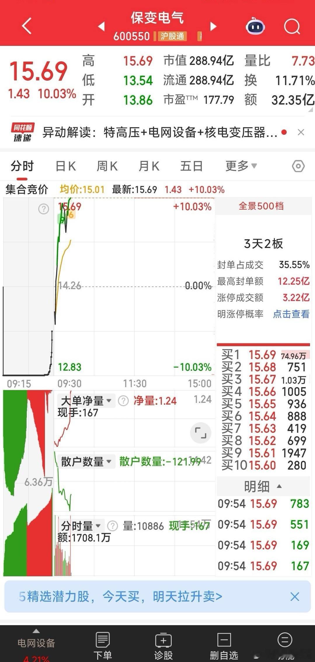 保变电气己板涨停,现等标准股份向上大阳突然,等汉缆股份,森源电气上车。