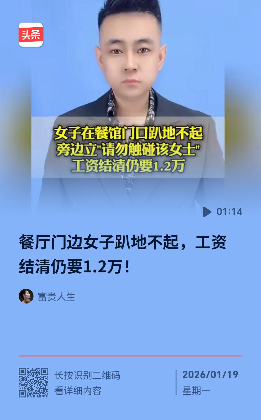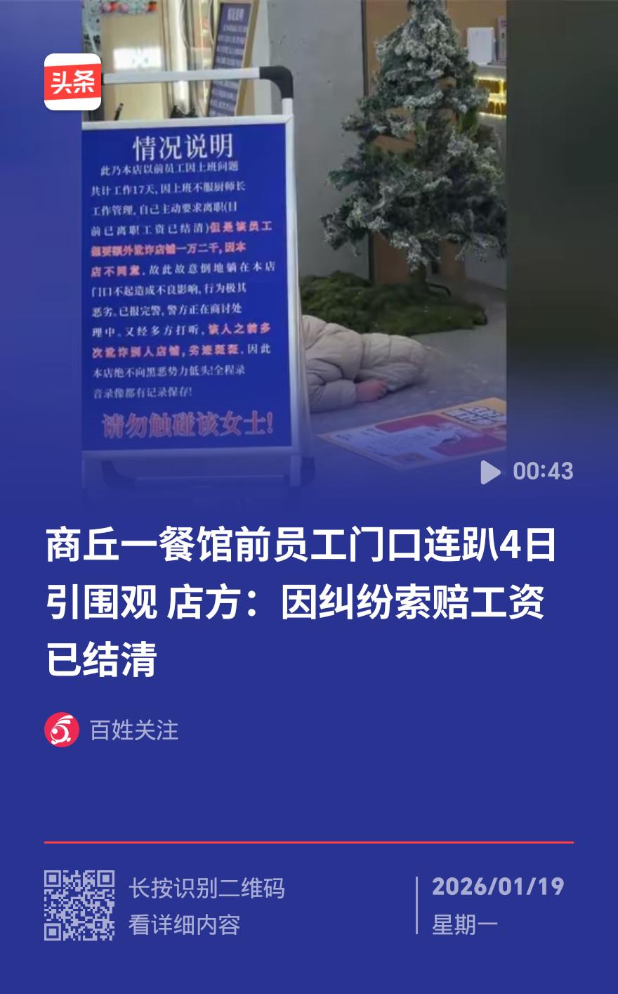 河南女子躺餐馆门口4天讹1万2!工资已结清,店家:生意被搅黄 河南商丘一餐馆门口,中年女子戴黑帽趴地4天,如“绊脚石”般堵住店门,索要1万2千元赔偿,店家直言“工资早结清,纯属讹诈”。 女子李某曾是餐馆面点师,干满17天。因做饼发面失误遭顾客投诉,被厨师长指责后当场撂挑子离职。店家当晚转账结清工资,没想次日李某反口称被辞退,要求赔偿。 协商无果后,李某开启“静默躺平”。餐馆开门她就躺,关门便离开,不吵不闹却让顾客纷纷绕路,店家营业额暴跌。 警察、调解员、医护人员轮番到场,李某见医护就起身说没事,人走再躺,不配合任何协商,只一句“老板欠我钱”应对。 店家陷入两难,给钱怕开恶意索赔先例,硬扛则日损营收。这种“软纠缠”如附骨之疽,让小本生意难顶。 开店遇这种“碰瓷式维权”该咋办?妥协还是硬刚?欢迎留言支招。美舰过航台湾海峡的目的是什么