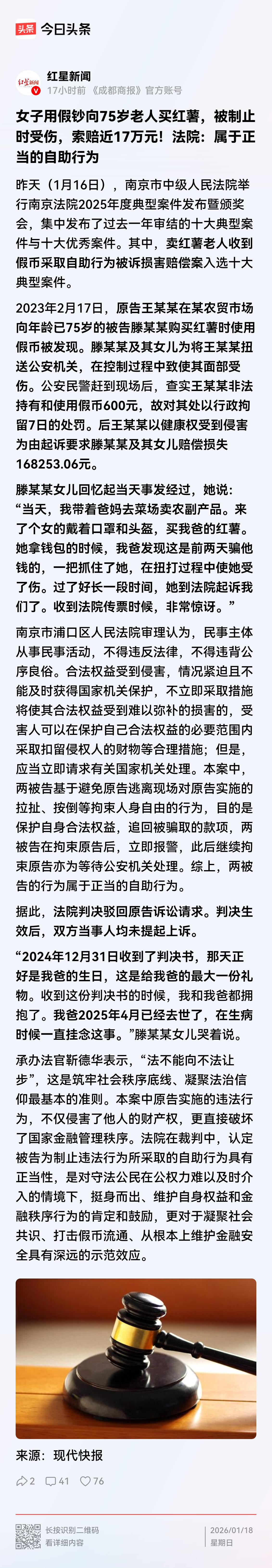 南京,75岁老人卖红薯,一女子用假币购买老人红薯。几天后,女子再次去老人摊前买红薯,被老人及其女儿认出,在把她扭送去派出所的过程中,致女子面部受伤。民警到场后,查实女子非法使用假币600元,对她拘留7日。事后,女子起诉到法院,要求卖红薯老人和其女儿赔偿她损失168253.06元。 2023年2月的一天,滕大爷像往常一样,把地里收的红薯装上车,拉到农贸市场摆摊。寒风里守了大半天,好不容易做成几笔生意,收摊回家清点钱款时,一张假币让他瞬间红了眼。 年事已高的他,种庄稼要耗费极大的心力,从播种、施肥到收获,每一步都靠双手操劳,卖红薯的钱都是点滴辛苦钱。偏偏他平时收的大多是零钱,大额钱币本就不多,所以对那个给假币的女子相貌印象格外深刻,哪怕对方当时戴着口罩和头盔,他也牢牢记住了眉眼间的特征。 一家人得知消息后又气又心疼,气骗子狠心欺骗老人,更心疼滕大爷连日的辛苦付诸东流。为了防止父亲再次受骗,也想碰碰运气能认出那个女子,滕大爷的女儿决定放下手里的事,每天陪着父母一起去集市卖红薯,寸步不离地守在摊位旁。 几天后,那个戴口罩头盔的女子果然再次出现在摊位前,假装挑选红薯,准备故技重施。滕大爷一眼就认出了她,当即伸手抓住女子的胳膊,女儿也立刻上前帮忙控制住对方,明确要把她扭送到派出所讨个说法。 混乱的拉扯过程中,女子的面部不慎受伤,她不停挣扎反抗,场面一度有些僵持,周围摆摊的商贩和路人也纷纷围了过来。 民警赶到现场后,迅速核实了情况,经查实女子不仅此次试图使用假币,此前还非法持有和使用假币累计600元,行为已违反相关规定,最终对她处以行政拘留7日的处罚。 本以为事情就此了结,可让人意外的是,女子拘留期满后,竟一纸诉状将滕大爷和他的女儿告上了法院,要求二人赔偿她医疗费、误工费等各项损失共计168253.06元。 收到法院传票时,滕大爷一家满心震惊又无奈,他们从没料到自己维护权益的行为,反而被对方倒打一耙。这场官司也成了滕大爷的心病,即便后来身体抱恙,也一直挂念着这事。 案件由南京市浦口区人民法院审理,法官认为滕大爷父女的行为属于正当自助行为——在合法权益受侵害、情况紧迫且无法及时获得公权力保护时,为防止女子逃离,在必要范围内采取拘束措施,且事后立即报警等待处理,并未超出合理界限。 2024年12月31日,法院最终判决驳回女子的诉讼请求,而这天恰好是滕大爷的生日,这份判决成了他收到的最好礼物。