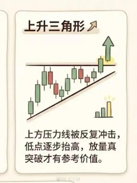 上升三角形 核心结构: 上方是水平压力线:股价多次冲高到同一价位附近回落,高点基本平齐。下方是向上倾斜的支撑线:股价回落的低点逐步抬高,形成上升趋势。成交量:形态形成过程中,成交量通常逐步萎缩,突破压力线时成交量需显著放大。 实战信号: 1. 买入信号:股价放量突破水平压力线时,是短线买入的核心信号,突破后压力线转化为支撑线。2. 止损信号:若股价跌破下方倾斜支撑线,形态失效,需及时止损离场。3. 目标位测算:突破后上涨空间≈三角形最宽处的垂直高度(压力线与支撑线起点的垂直距离)。