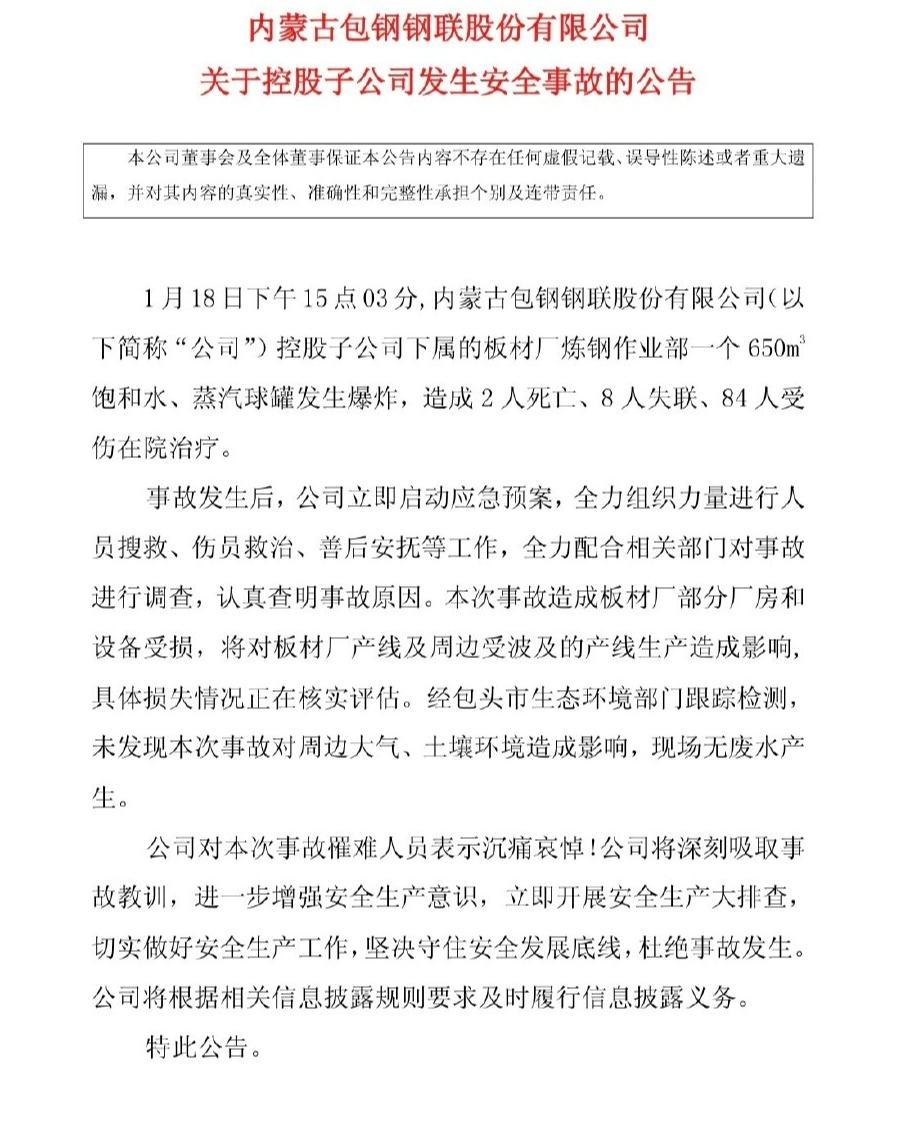 在1月18日下午内蒙古包头包钢稀土钢板材厂炼钢作业部,一个650立方米球罐爆炸,现场铁门炸飞数米,周边居民玻璃震晃,最新伤亡和处置全曝光! 事情发生在1月18日当天下午15:03发生爆炸,饱和水蒸汽球罐炸穿厂房,天花板坍塌、设备散落满地,现场还检出煤气泄漏隐患。 目前确认2人遇难、8人失联仍在搜救,84人送医,其中5人重症,其余多为头外伤和软组织挫伤,生命体征平稳。 官方已成立调查组,涉事企业责任人被公安控制,事故厂区停产,周边5公里排查无结构安全问题,水电暖通信正常,暂未污染环境。知情人:包钢厂区爆炸疑因转炉故障 包钢厂区爆炸影响了哪些企业 包刚钢铁厂 爆炸 愿失联者平安,静待事故原因最终公布!
