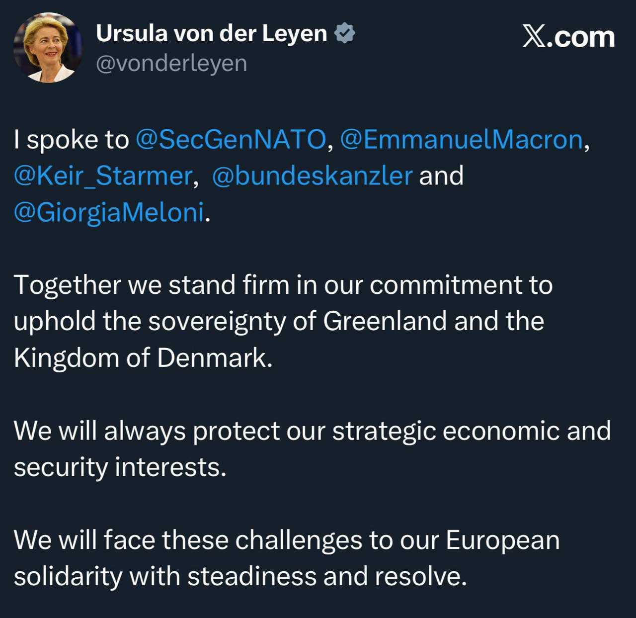 欧盟委员会主席冯德莱恩:我与吕特、马克龙、斯塔默、默茨和梅洛尼进行了交谈。我们共同坚定地致力于维护格陵兰岛和丹麦王国的主权。我们将始终保护我们的战略经济和安全利益。海外新鲜事热点现场