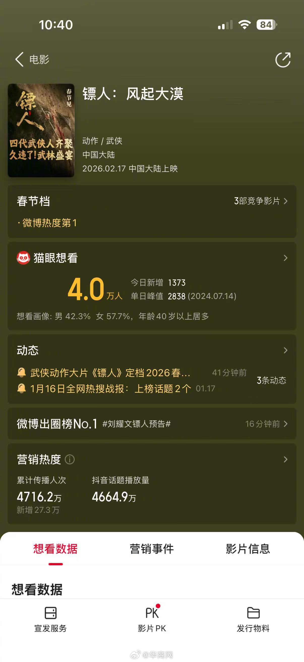 【#镖人想看已超4万人#】近日,电影#镖人# 官宣定档2026春节,#镖人预告片公布# 首支预告来了!“江湖”二字,影片集结四代武侠人力量,从马上追逐到近身肉搏,拳脚招式间尽显凌厉动作质感。据了解,该影片由袁和平执导,吴京监制的武侠动作冒险电影。