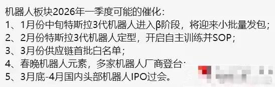 【说说人形机器人】周末确认,今年机器人将再度登上春晚!据说有3到4个机器人相关节目,宇树、智元等这是要打擂台啊!周末机器人的催化还不少:第一、全国机器人标委会商业社区服务机器人工作组成立。第二、央视确认:机器人将再度登上春晚舞台。第三、马斯克发布与机器人的共舞视频。周五人形机器人拉升,主要是卡了商业航天的资金。但机器人还不能确认其主线低位,毕竟存储芯片、半导体方向的业绩更受资金认可!这个方向可以给点仓位,重点关注T链、宇树概念相关核心标的。总之,春节前后科技看两个方向,一是消息刺激的人形机器人、AI应用,商业航天;二是涨价的存储、自主可控的AI芯片、半导体设备。