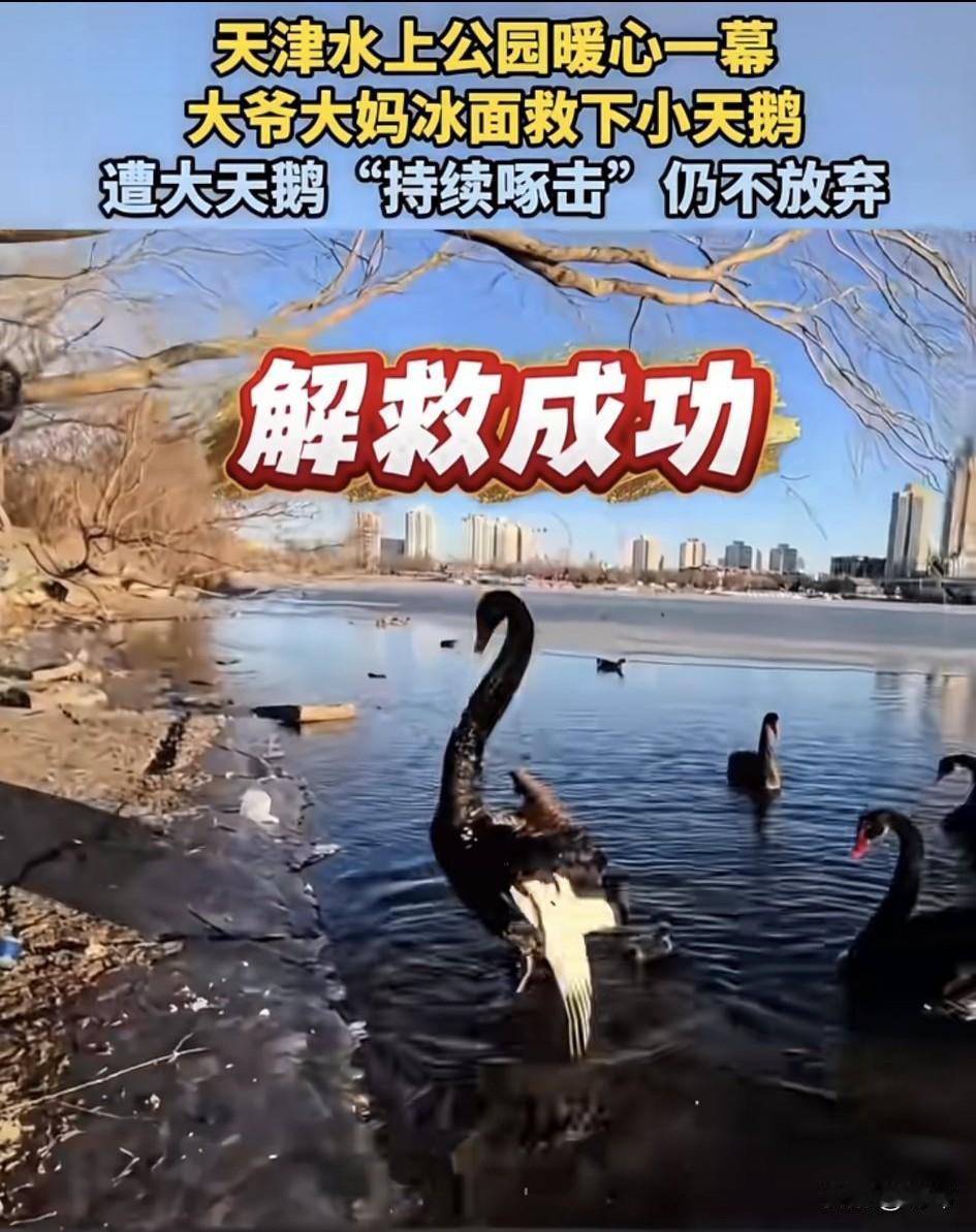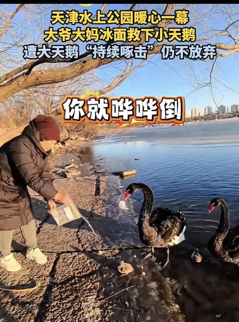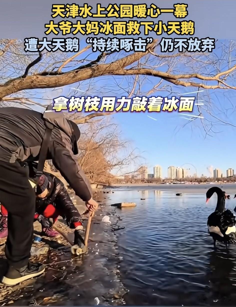 泪目了!这天一位大爷和大妈去公园散步,当她们走到一个人工湖的时候,听到有天鹅哀嚎的声音,于是他们赶紧上前查看,结果看到一只很小的天鹅被湖边浅水区的冰给冻住了,而大天鹅急得一直哀嚎。 善良的大爷大妈顿时心生怜悯之心,于是决定救助小天鹅,大妈用塑料袋装了湖水去浇在小天鹅的身边,试图融化冰面,让它脱困,可收效甚微,而且大天鹅以为他们在伤害小天鹅,一直疯狂的攻击大妈。这时候大爷想到了别的办法,找来一根树枝,不停地敲着冰面,而大妈则用手抵挡大天鹅的攻击。 终于在他们的不懈努力下,小天鹅成功脱困了,大妈拿起小天鹅把它放在了大天鹅的面前,它们开心的离去了!