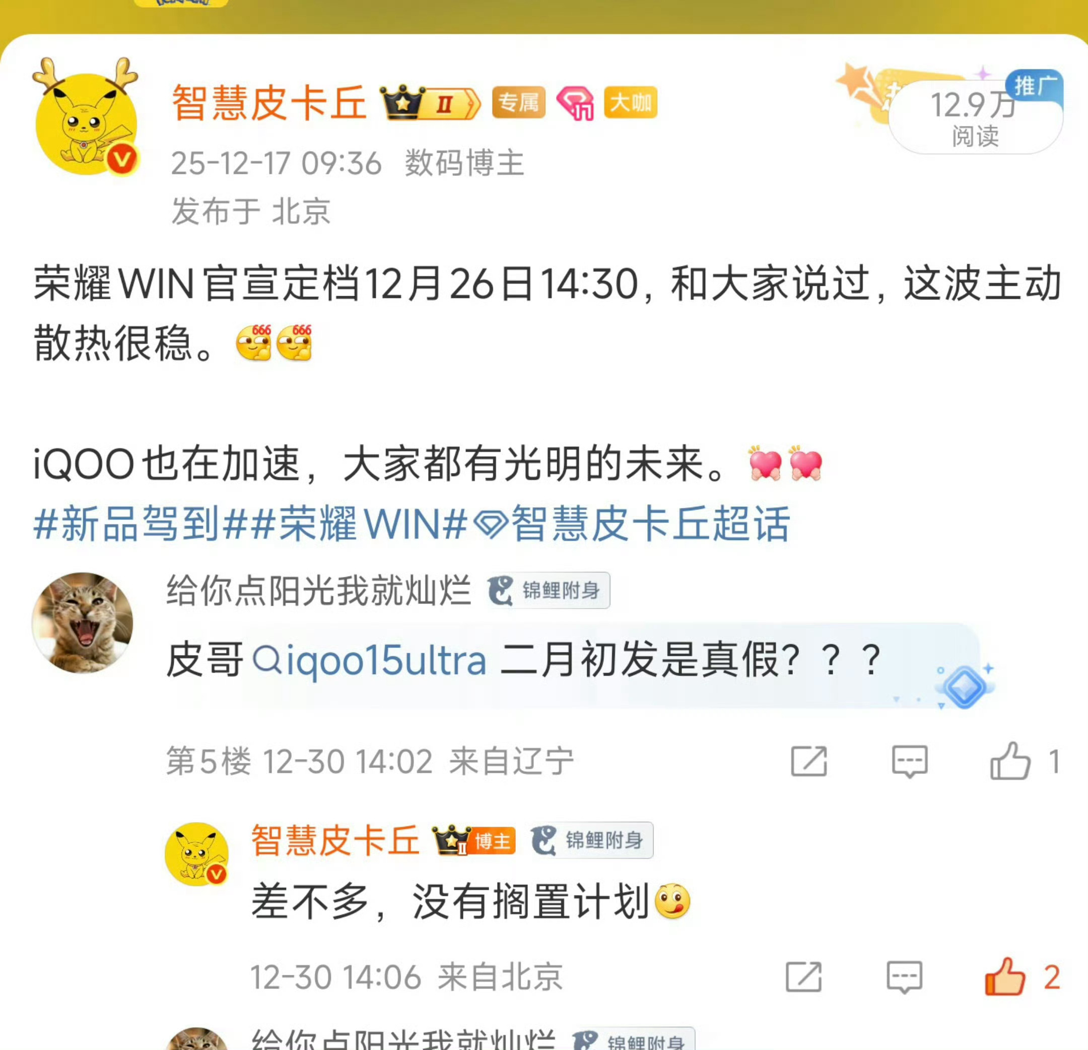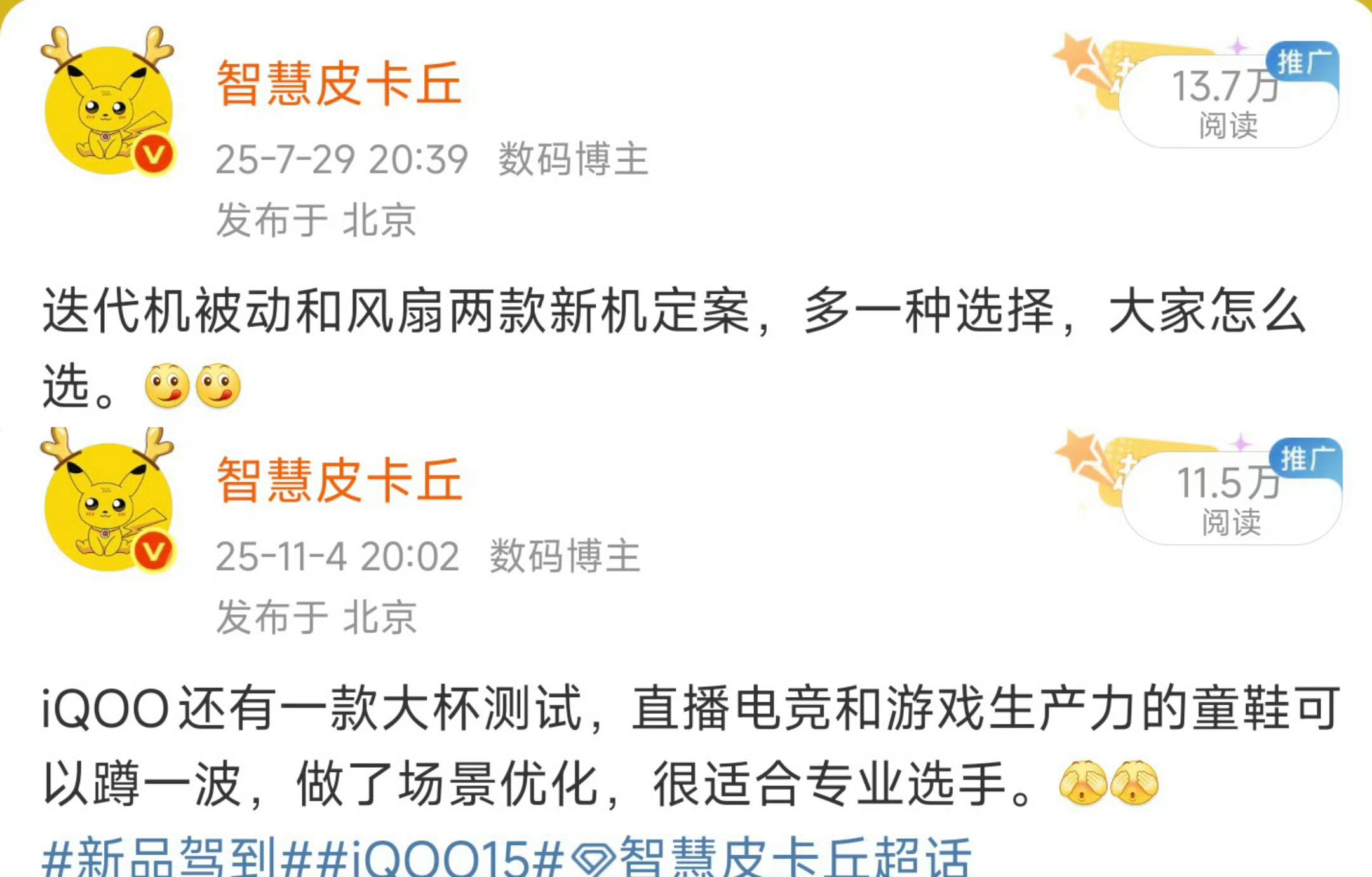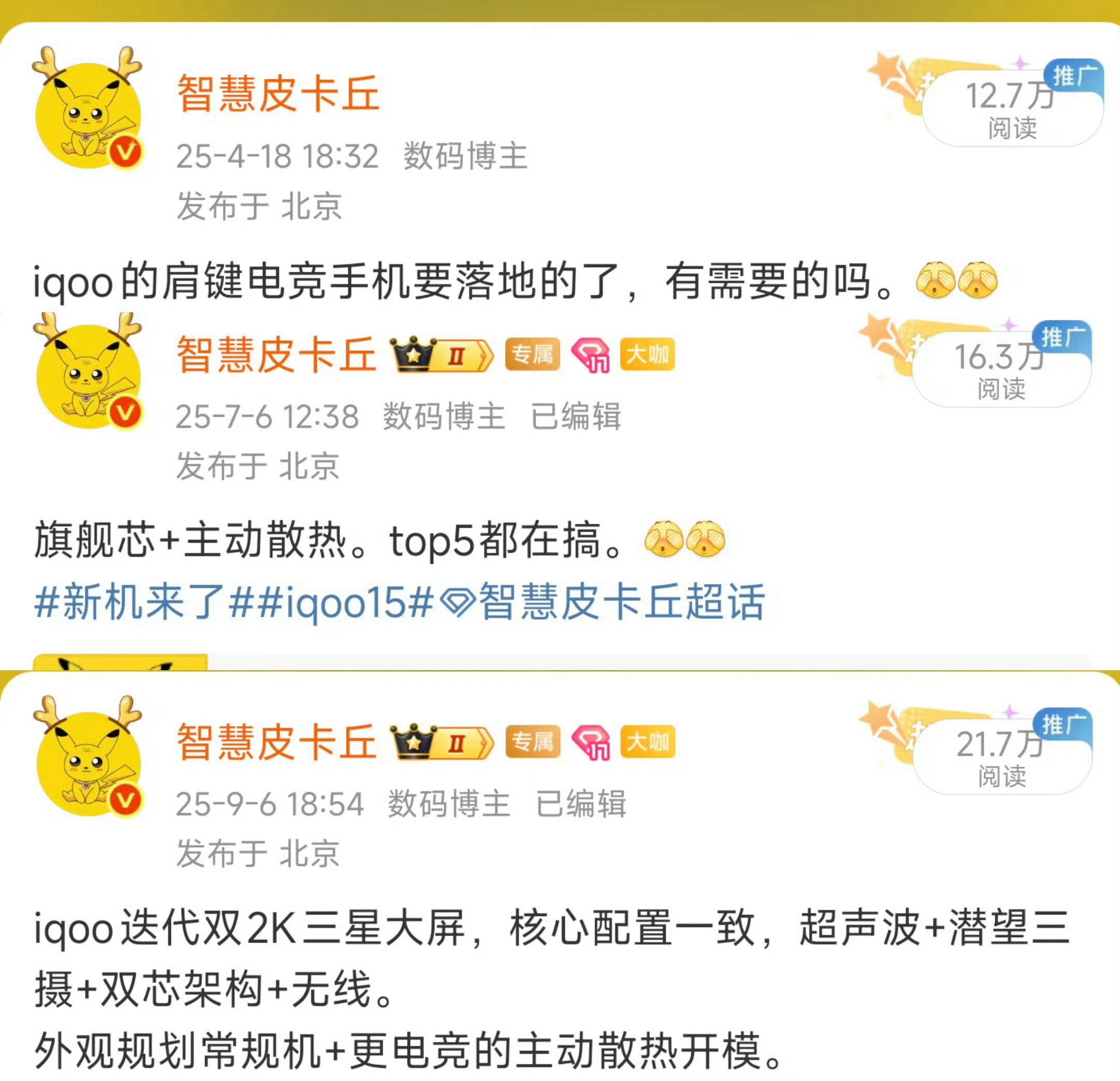 iQOO15Ultra开启预热。给大家透漏过: 主动散热+肩键+游戏直播优化+风扇保。主打性能生产力,有需要的童鞋吗。新品驾到iQOO15Ultra智慧皮卡丘