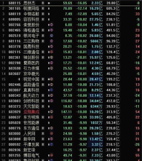 今天A股跌幅榜,依然有近30家跌停,跌超10%!海格通信一字跌停,连续3个一字跌停,跌停封单不但没有减少,反而增多,55亿封单,多杀多;银河电子3个跌停,三江购物2个一字跌停,国晟科技3个跌停,2个一字;三维通信2个一字跌停;神剑股份3个跌停;鹭燕医药3个跌停;引力传媒2个跌停;视觉中国2个跌停;直真科技3个跌停;东方通信3个跌停;人民网2个一字跌停;新华网2个跌停;平潭发展3个跌停,等等。 市场跌幅榜,清一色的高标强股,主要集中在商业航天,AI应用主线,上周重点被降温的对象。 整个高标股接力情绪冰点,上周五连板数量近6家,而6家连板股,今天仅新华百货1家晋级,现在高标,连板,涨停是重点降温对象,资金不敢接力。 未来市场情绪稳定,跌幅榜跌停股大面积消失是重要信号,跌停股代表最强亏米效应,如果不消失,市场情绪不企稳。