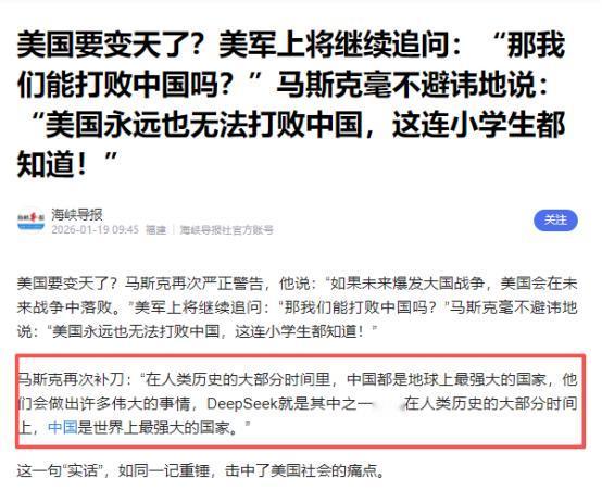 外国记者问,美国拥有的核弹头足以摧毁世界1000次,难道中国人一点也不害怕吗?对此,马斯克早已给出回答,中国并不是崛起,而是在回到本来属于自己的高度。自古以来,中国就是世界顶尖的强国,他们有很多聪明的人才,会做许多伟大的事情,DeepSeek只是一个开始……   历史上的中国见过太多"绝对优势"。汉朝时匈奴的骑兵曾让长安戒严,唐朝时突厥的颉利可汗打到渭水便桥,这些武力威胁最终都成了史书里的注脚。郑和下西洋时的宝船舰队,吨位远超同时代欧洲战舰,却从未用武力掠夺一寸土地——这种对力量的克制,源自文明深处的底气。   今天的中国,不是1840年被坚船利炮打开国门的弱国,而是拥有完整核威慑体系、全球第二大经济体的主权国家。当美国政客用"摧毁世界1000次"说事时,他们可能忘了:核武器的最大意义不是毁灭,而是让持有者明白毁灭的代价。中国从第一颗原子弹爆炸起,就承诺不首先使用核武器,这种底气,来自对自身防御能力的清醒认知。   看看台海的例子。新西兰军舰不远万里来台海"自由航行",解放军7艘军舰贴身跟监,歼-16战机直接模拟攻击。这种反制不是冲动,而是算准了对方的底牌——新西兰1.5万人的军队、没有重型武器的补给舰,拿什么在台海玩火?   就像面对美国的核讹诈,中国早就算清了账:我们的东风导弹能突破任何反导系统,我们的核潜艇藏在深海,我们的工业体系足以支撑持久战。这些硬实力,让中国在面对威胁时,既能保持"你打你的,我打我的"战略定力,又能精准反制对方的软肋。   西方总爱用"害怕"与否来衡量国家意志,却不懂中国人的"怕"从来分轻重。我们怕的是14亿人吃不饱饭,怕的是台湾从祖国分裂出去,怕的是文明传承出现断层。   至于所谓"核毁灭"的恐吓,经历过抗美援朝、珍宝岛战役的中国人太清楚:当一个民族把身家性命和土地绑在一起时,再多的核弹头也吓不退守护者。就像新疆的坎儿井,2000多年来被风沙掩埋无数次,可只要有人在,就会重新挖通水渠——这种韧性,才是中国不害怕的根本。   现在的中国,正用马斯克说的"回到本来的高度"的方式,重新定义大国博弈。我们不搞"修昔底德陷阱",但也不怕别人制造陷阱。当美国在亚太部署反导系统时,我们的北斗卫星已经覆盖全球;当日本政客叫嚣"台海有事就是日本有事",我们的军舰已经在琉球群岛附近常态化巡航;当新西兰以为靠"五眼联盟"撑腰就能挑衅,解放军的模拟攻击已经让他们明白:任何势力在台海的小动作,都逃不过14亿人的眼睛。   这种底气,藏在深圳凌晨灯火通明的科技园里,在敦煌壁画修复师的手术刀下,在福建渔民自发守护钓鱼岛的渔船上。核弹头能摧毁城市,但摧毁不了文明的韧性;军事威胁能制造恐惧,但吓不倒认准道路的民族。中国人的字典里,从来没有"害怕"这个选项,有的只是"犯我中华者,虽远必诛"的传承,和"行稳致远"的智慧。