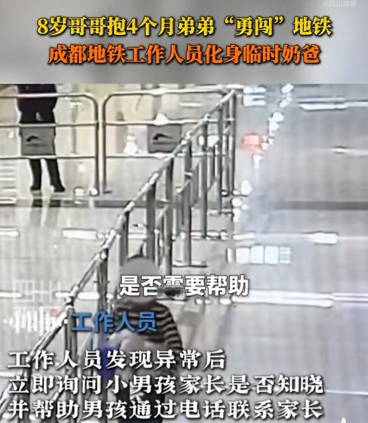 8岁哥哥抱4个月弟弟坐地铁 地铁工作人员暖心守护终寻家长 成都地铁里这一幕也太让人揪心又暖心了!一名8岁小男孩抱着4个月大的弟弟独自出现在东光站厅,小小的身躯抱着襁褓中的婴儿,脚步都有些不稳,瞬间引起工作人员注意。 工作人员发现后立刻上前询问,得知男孩是想带着弟弟出门,却没说清具体去向,也记不全家长联系方式。看着怀里熟睡的小宝宝,工作人员赶紧接过孩子,化身临时奶爸,动作轻柔又细心。 男孩说爸爸妈妈平时很忙,自己在家常帮着照顾弟弟,这次是想带弟弟去附近找亲戚,没想到坐地铁时会被拦下。小家伙说起照顾弟弟的日常,还会熟练地哄宝宝,透着超出年龄的懂事。 地铁工作人员一边安抚紧张的哥哥,一边通过广播和系统查询联系家长,同时给小宝宝找来干净的小毯子盖好,生怕孩子着凉。周围乘客也纷纷帮忙,有人递水给哥哥,有人逗着小宝宝,场面格外温馨。 大概半小时后,孩子妈妈急匆匆赶到车站,看到两个孩子安然无恙,紧紧抱住他们连声道谢。原来妈妈临时出门办事,没留意孩子悄悄溜了出去,发现孩子不见时差点急疯。 妈妈说平时哥哥就特别疼弟弟,会主动帮忙喂奶、换尿布,是妈妈的小帮手,这次也是想给弟弟“放放风”,没想到差点酿成危险。看着懂事又有点莽撞的儿子,妈妈又心疼又无奈。 网友们看了视频都被暖到,有人夸8岁哥哥太有担当,小小年纪就懂得照顾弟弟;更多人点赞地铁工作人员的细心负责,关键时刻及时出手,避免了意外发生。 其实独自带娃出门风险真不小,4个月大的宝宝需要专人时刻看护,8岁的孩子本身也缺乏应急能力,万一遇到拥挤、迷路等情况,后果不堪设想。 暖心的守护背后,更要重视孩子的安全监管,家长再忙也不能忽视对孩子的看护,尤其是年幼孩子,一定要告知他们不能独自外出,同时做好安全教育。 这次事件是幸运的,有负责任的工作人员和热心乘客帮忙,但不是每次意外都能化险为夷。希望所有家长都能引以为戒,时刻绷紧安全这根弦,守护好孩子们的成长之路。 说到底,孩子的懂事值得称赞,但成年人的监护责任更不能缺位。愿每个孩子都能在安全的环境里长大,也愿这份人间善意能一直传递下去。上热搜 @DOU+小助手
