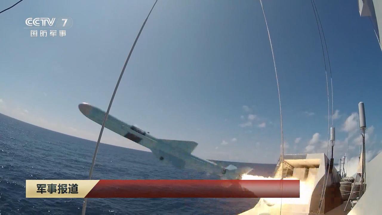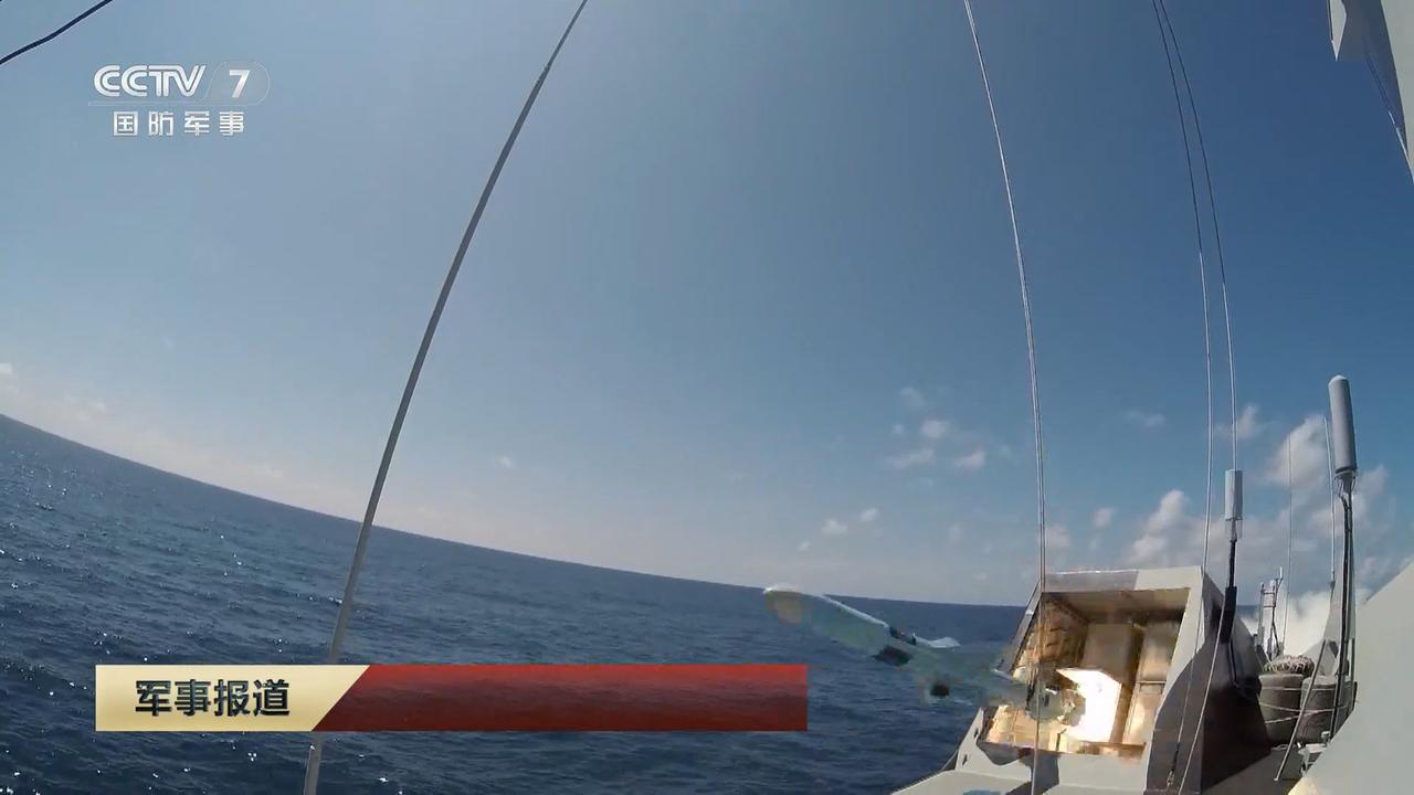 22型导弹快艇在发射反舰导弹。22艇可以携带8枚鹰击八三反舰导弹,火力密度可以媲美054A导弹护卫舰,一个分队四艘22艇出击,一次齐射可以发射32枚反舰导弹,形成对敌人舰队饱和攻击。这一发鹰击八三还是采用的纯单脉冲雷达导引头,没有红外复合制导。弹体中部的黑色部分,不清楚是什么东西,主翼下也有一个黑色斑点,也许会是中继数据链通信天线。