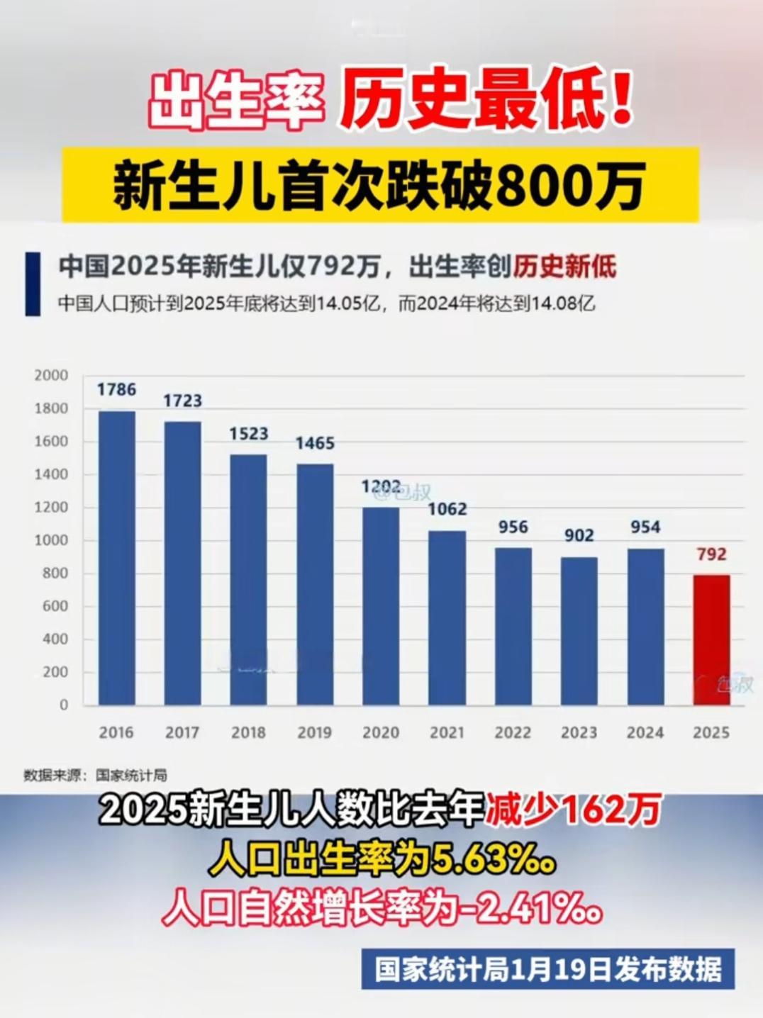 国家统计局官方数据,2025年新生儿792万! 从1786万到792万,比腰斩还少。 建议想报考师范的学生要谨慎。 不再内卷,未来其实好多孩子都可以保送大学了。 谁有孩子,谁就拥有未来的中国,同样的资源,分到更少的人头上,一定是分的更多,更富裕。 别担心养老负担,等那时候,保姆机器人早就普及了,有市场,自然会有产品。 因此,目前最好的投资,也许不是房子,而是响应国家号召,生个孩子[赞]! 中国出生人口率 中国出生率