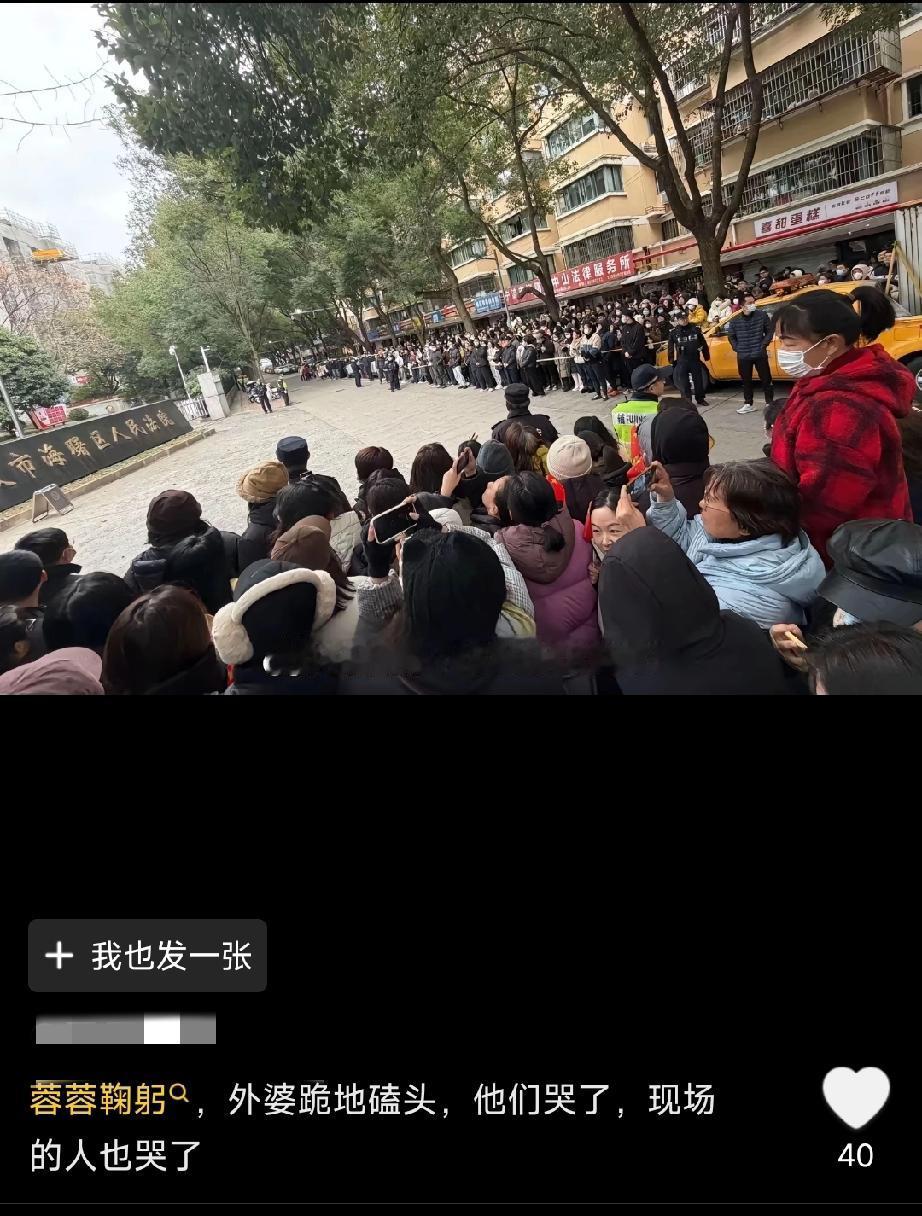 看一次,哭一次, 外婆对着大家磕头,妈妈一次次鞠躬, 法院外面是一大群自发到现场支援的宝妈宝爸们。 没有大的网红、新闻媒体帮助站台,最后只有我们这些普通人去帮助普通人。 今天全国大范围降温,却还有很多妈妈怀里抱着孩子到了现场。 每一个人不光是在帮她们,更是帮自己,帮自己的孩子,下一次不会受到同样的伤害!