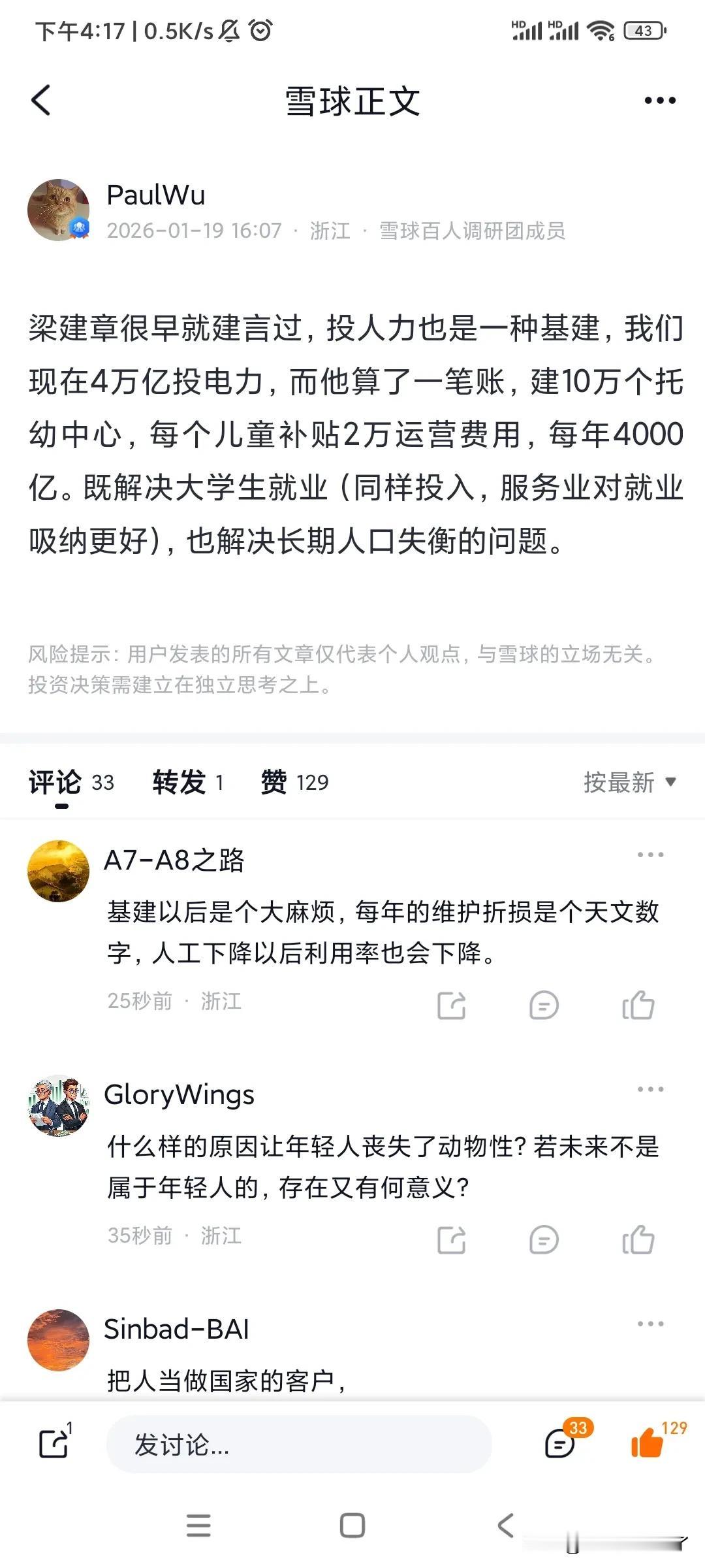 我支持携程梁建章……把钱投进生育、下一代……不然这么多天量基建谁来摊销……真指望机器人来养老???