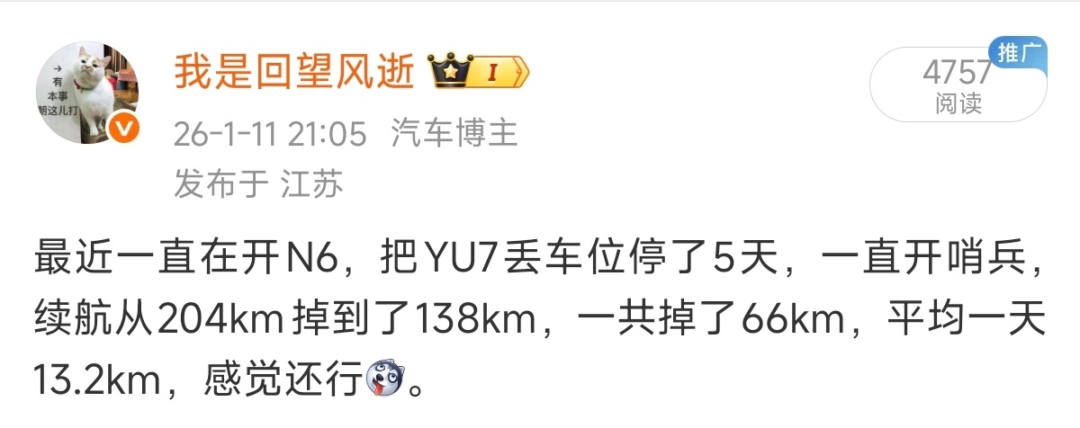 充到497km丢车位上放了8天,开哨兵模式掉了80km,一天掉10km,也还行。