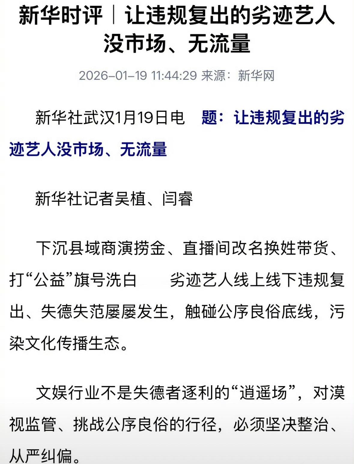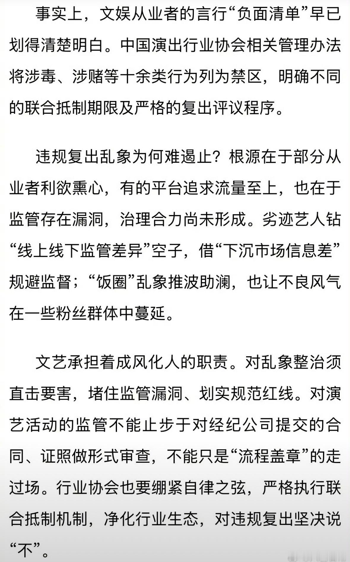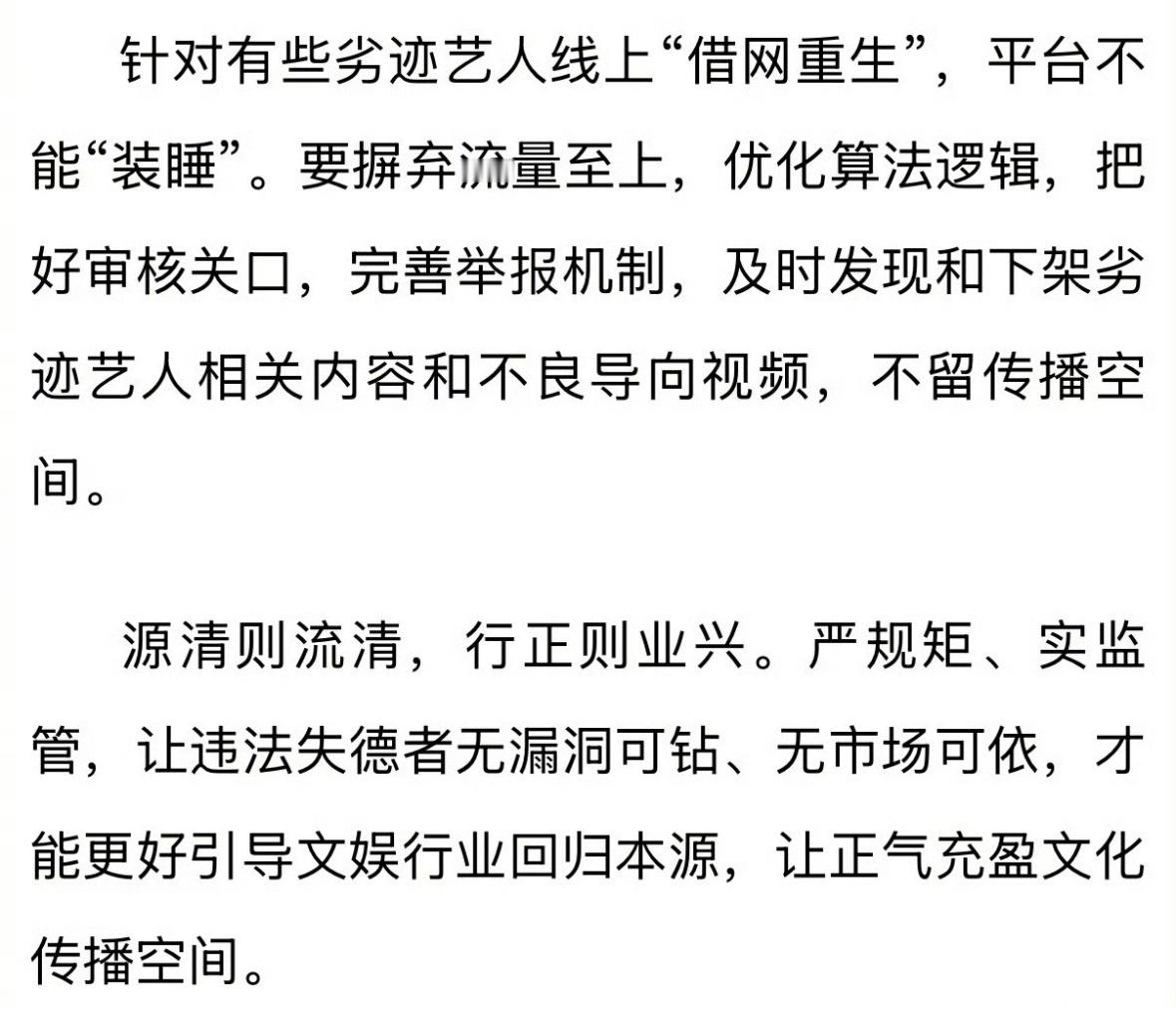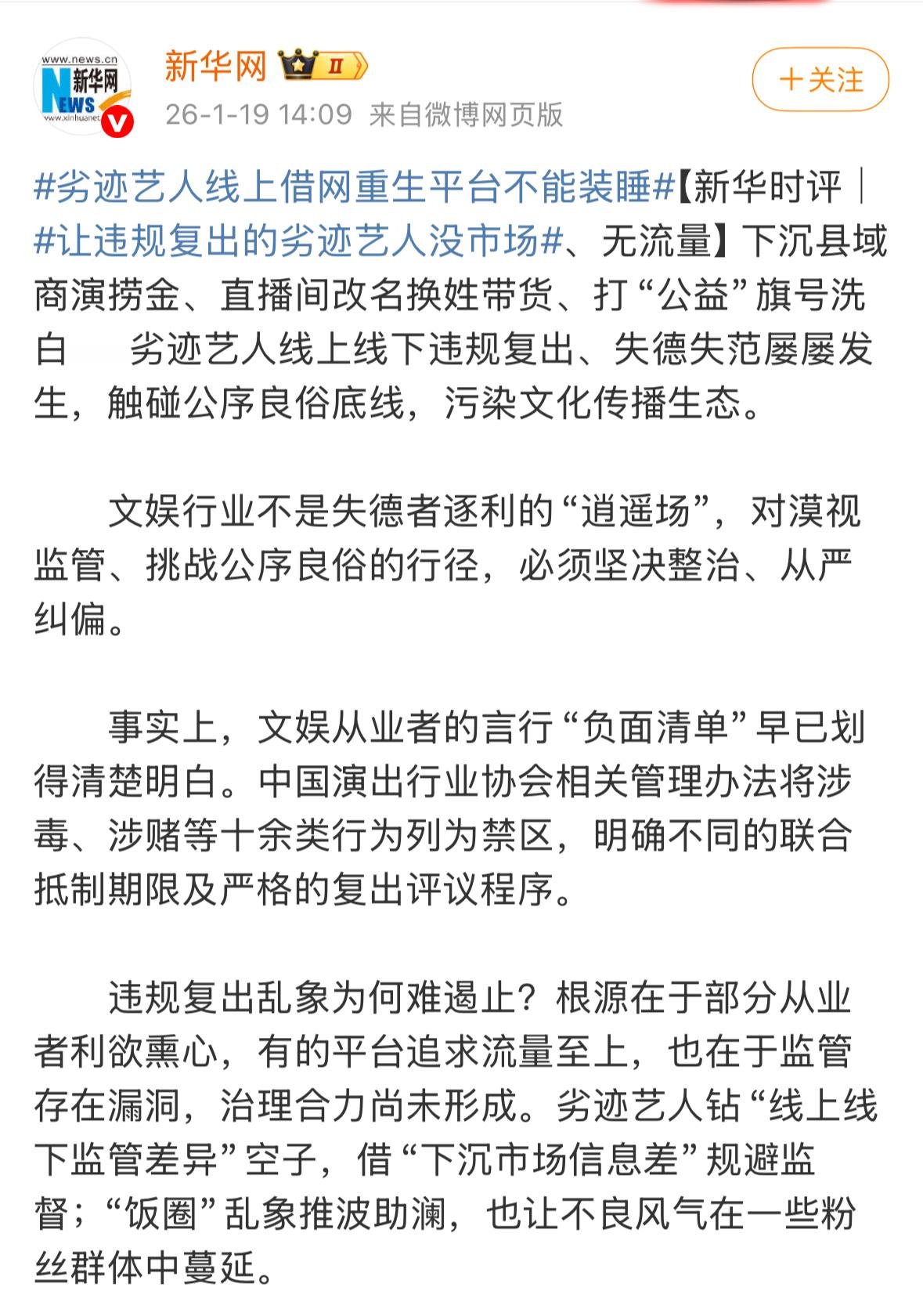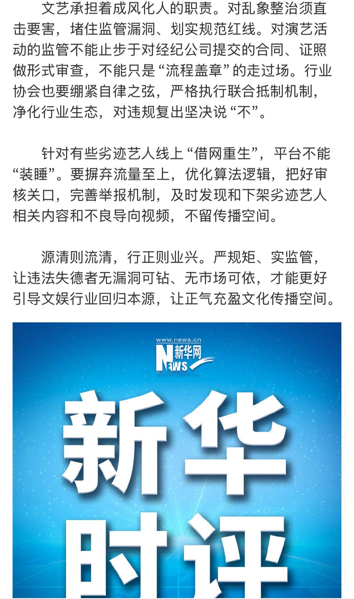 新华社发文,文娱行业不是失德艺人的逍遥场,对漠视监管、挑战公序良俗的行径,必须坚决整治。