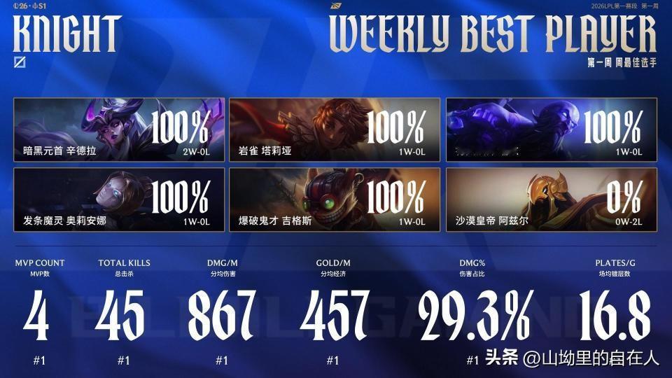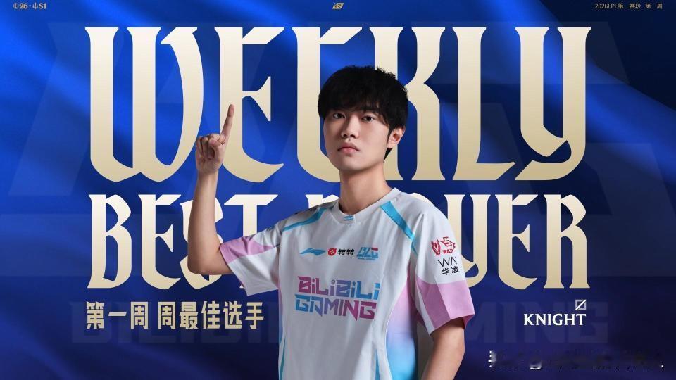 2026年LPL第一赛段首周最佳阵容已于1月19日公布。 - 上单:BLG.Bin - 打野:AL.Tarzan - 中单:BLG.Knight(周最佳选手) - 下路:BLG.Viper - 辅助:BLG.ON