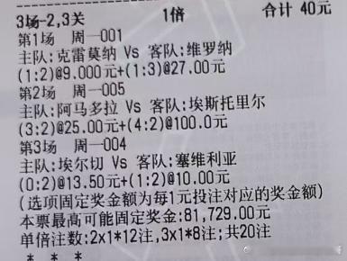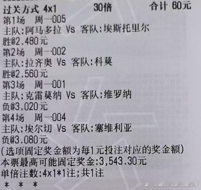 001 意甲 克雷莫纳vs维罗纳负 1-2 1-3002 意甲 拉齐奥vs科莫胜 1-0 2-0004 西甲 埃尔切vs塞维利亚负 0-2 1-2005 葡超 阿马多拉vs埃斯托里尔胜 3-2 4-22串:005胜 002胜4串:005胜 002胜 001负 004负比分串:001(1-2 1-3)005(3-2 4-2)004(0-2 1-2)