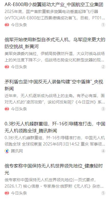 最近刚进入2026年,俄罗斯一位无人机领域的资深专家就放话了:中国在无人机上已经稳稳坐住了全球老大的位置,2025年的几大突破让大家看得眼热,2026年估计还会继续拉大差距! 麻烦看官老爷们右上角点击一下“关注”,既方便您进行讨论和分享,又能给您带来更多优质的内容,感谢您的支持! 2026 年刚拉开序幕,俄罗斯无人机领域就传来了对中国的高度认可。俄罗斯《无人机》杂志主编丹尼斯・费杜季诺夫作为该领域资深专家,公开表示中国已稳稳坐上全球无人机领域的头把交椅,2025 年的多项技术突破让外界艳羡不已,2026 年还会继续拉大与其他国家的领先差距。 这一评价并非空穴来风,而是基于全球无人机格局的深刻变革。2020 年代以来,世界无人机发展版图被重新改写,中国凭借持续的技术投入和产业积累,成为该领域推进速度最快、覆盖场景最广的国家,更实现了从单一产品到体系化发展的关键突破。 到了 2025 年,中国无人机的发展更是迎来了丰收年,察打一体、蜂群作战等全品类无人机技术链全面成熟,形成了从轻型到重型、从民用至军用的完整产品谱系。不管是战场打击还是民生服务,都能看到中国无人机的身影,技术实力得到全面验证。 这一年,多款新型无人机的亮相让世界看到了中国在智能技术上的飞跃。300 架无人机组成的蜂群能在 0.3 秒内完成战术分组和阵型重组,被 “击落” 后还能在 2 秒内自动补位,自主决策和自愈能力达到新高度。这种分布式协同作战模式,标志着中国在集群控制技术上的绝对领先。 与此同时,中国在无人机反制与对抗领域也形成了闭环思维,构建起多层次的综合防御体系。2025 年内蒙古的实战演练中,OW5 车载激光武器系统能无声无息击落数公里外的目标,红旗 - 17AE 防空导弹、“飓风 3000” 定向能武器等装备,共同编织起 “空中盾牌”,实现了攻防兼备。 中国无人机的崛起,离不开强大的产业基础支撑。完整的制造业体系和成熟的供应链,让中国无人机在成本控制、迭代速度和可靠性上具备明显优势。全球商用无人机市场中,约 7 成产品来自中国,核心部件的产能和专利占比更是遥遥领先。 俄乌冲突的实战案例,让俄罗斯专家对无人机战争有了更深刻的认知。这场冲突中,无人机的规模投放、快速更新和战场适应能力,成为影响战局的关键因素。而这些恰恰是中国无人机的强项,规模化制造能力和快速响应市场的迭代机制,让中国在这类消耗战中具备天然优势。 2025 年,中国无人机的技术突破亮点纷呈。CH-7 大型隐形无人机启动飞行测试,飞翼布局赋予其出色的隐蔽侦察能力;16 吨级的 “九天” 重型察打无人机成功首飞,可挂载反舰导弹和制导炸弹执行重载任务;“镧影 R6000” 倾转旋翼机的无人驾驶版本完成试验,有效载荷最高可达 2 吨。 民用领域同样捷报频传,国产首款重载多旋翼电动垂直起降飞行器 AR-E800 在江西景德镇成功首飞,具备自动避障、航线自主规划等智能功能,在天津国际直升机博览会上一举斩获 160 架订单,展现出强劲的市场竞争力。 这些成果的背后,是中国对无人机产业链的全面布局。从高性能电池、轻质复合材料到智能飞控系统,关键环节均实现自主可控,航空工业等龙头企业更带动了上下游产业协同发展,形成了从研发设计到运营服务的完整生态。 有人 - 无人协同作战的突破,更是让中国无人机的作战效能翻倍。歼 - 16 战机通过数据链引导无人机群实施佯攻,无人机回传的实时战场数据又为战机提供精确火控参数,这种异构平台协同模式,让作战体系的灵活性和打击精度大幅提升。 俄罗斯专家费杜季诺夫也客观指出,美国在高端工艺和部分军用系统集成上仍有优势,但中国的领先体现在全谱系研发、全产业链支撑和全球市场份额的综合优势上,这种全面发展的态势让其他国家难以在短期内追赶。 展望 2026 年,中国无人机的领先优势还将持续扩大。一方面,无人机将深度融入陆海空天一体化作战体系,通过 “智联 - 2000” 等战术通信系统,实现与各类作战平台的无缝衔接,形成全域打击网络。 另一方面,中国无人机将持续结合海外用户的实际使用反馈,针对性地进行迭代优化。同时加快适航取证进程,AR-E800 等产品计划在 2026 年 9 月完成取证并交付用户,进一步拓展全球市场。 航空工业已规划了从 AR-E40 到 AR-E3000 的 eVTOL 产品谱系,全电、混动、新能源三线并进,2026 年还将投入 11 架领先试用样机,开展千小时万架次的场景化试飞,持续打磨产品性能。 中国无人机的崛起,正在悄悄重塑全球战争门槛和国际安全格局。低成本、高效能的无人机作战模式,让传统军事强国的优势被削弱,而中国在该领域的技术输出和产业辐射,也在影响着全球安全力量的平衡。