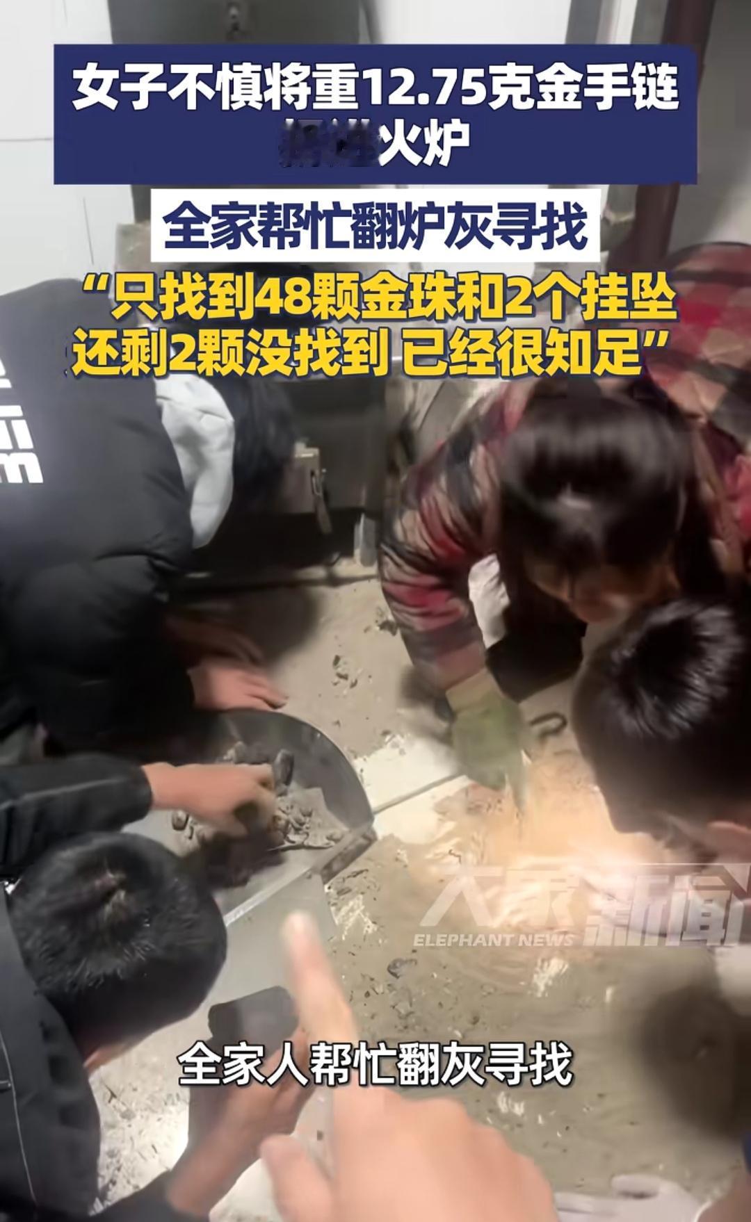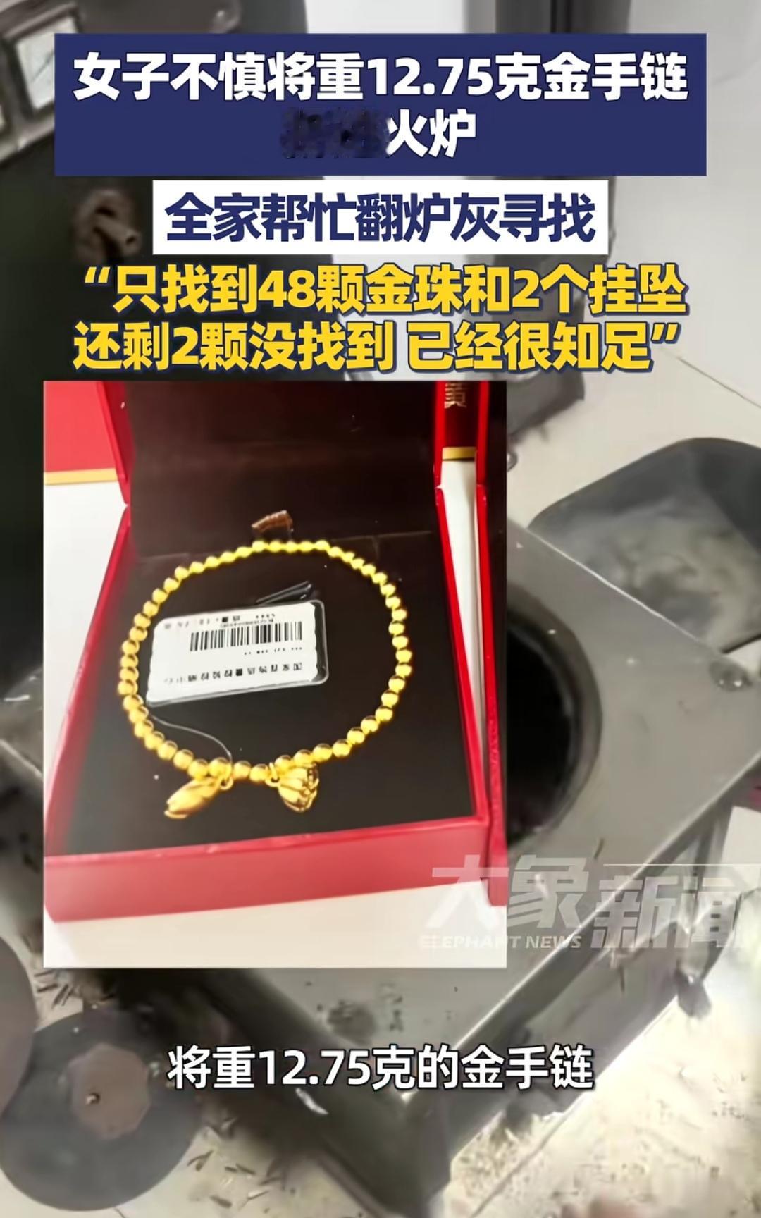 真金不怕火炼之火炉销金。 (如图所示)一女子真是经历了喜忧参半的一天,忧的是不慎将一串12.75克的金手链扔进了火炉里,喜的是经过全家人的翻灰仔细查找后,找到48颗金珠和2个挂坠,还有2颗金珠神秘消失。按理说,真金不怕火炼,应该称一称总重量,那2颗金珠到底去哪里了?难道是有人鱼目混珠?