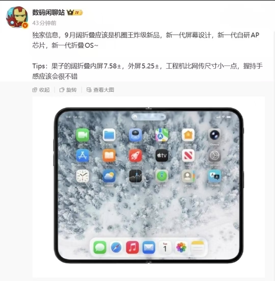 网传小米的阔折叠新机定在九月亮相,光看曝光的参数就离谱——内屏7.58英寸+外屏5.25英寸,工程机还比网传尺寸更小,握持手感直接拉满。咱就是说,小米这是打算把平板和手机揉一块儿造啊?新一代屏幕设计+自研AP芯片+折叠OS,全套“新一代”buff叠满,之前还传这台阔折叠有潜望镜、大尺寸横向屏,甚至可能是行业首台大尺寸横向阔折叠,小米这要是真成了,折叠屏的玩法怕是又要被重新定义了。科技数码