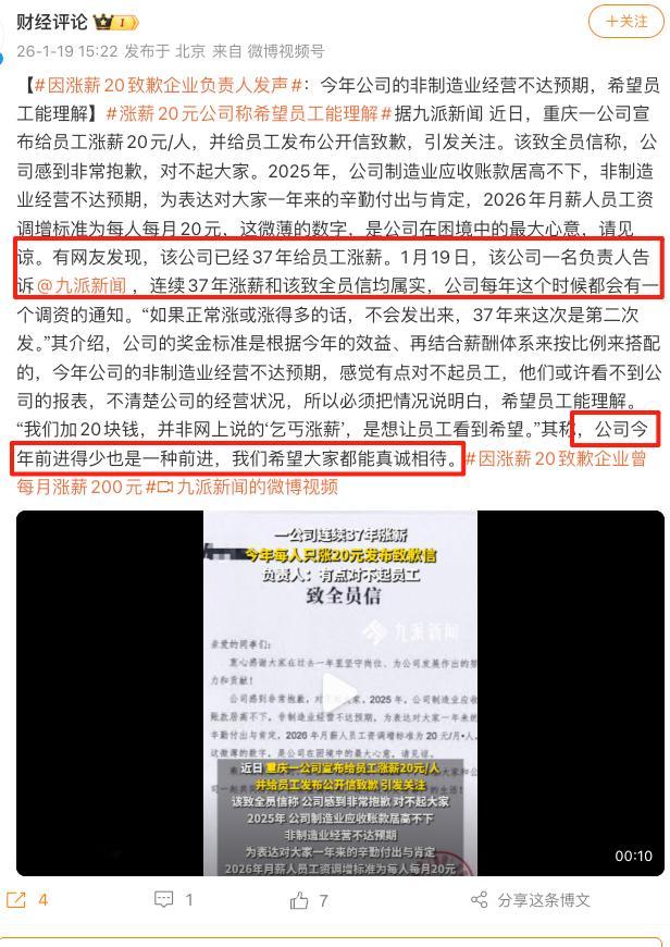 因涨薪20致歉企业负责人发声 这个世界怎么啦?涨薪20怎么啦?涨薪涨得少也需要道歉?你不满你可以辞职啊,你那么牛逼可以去别的公司拿更高工资啊。公司和员工不是双向自由选择么?感觉现在某些人成病态了~涨薪20元公司称希望员工能理解