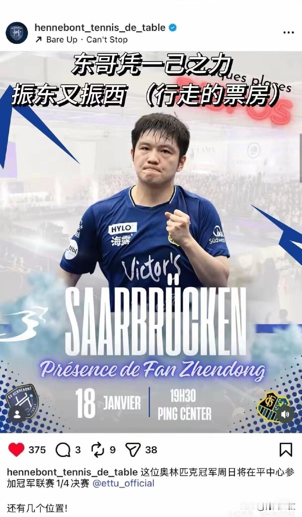亨尼邦俱乐部虽然被打败了, 他们却高兴了, 还用了樊振东照片做海报, 称东哥是行走的票房! 因为他们门票收入获得新高, 全法国的球迷从四面八方赶来看小胖打球! 这样的比赛,再来几场吧, 哪怕输了也高兴![呲牙]
