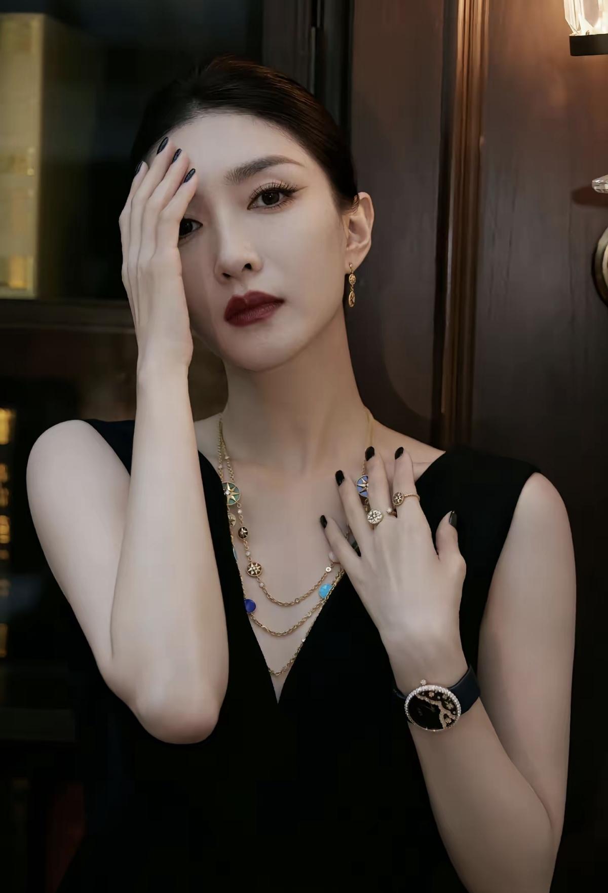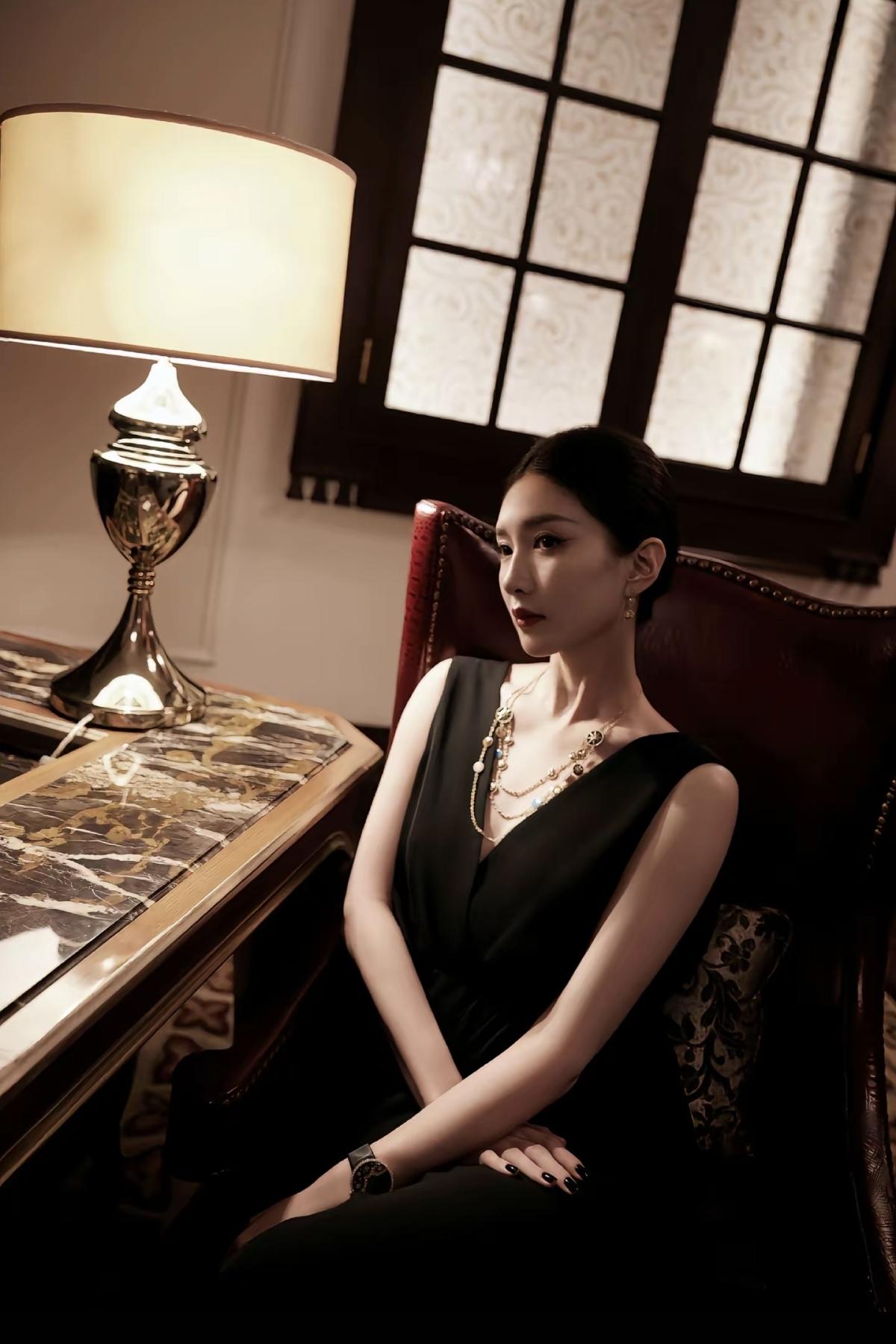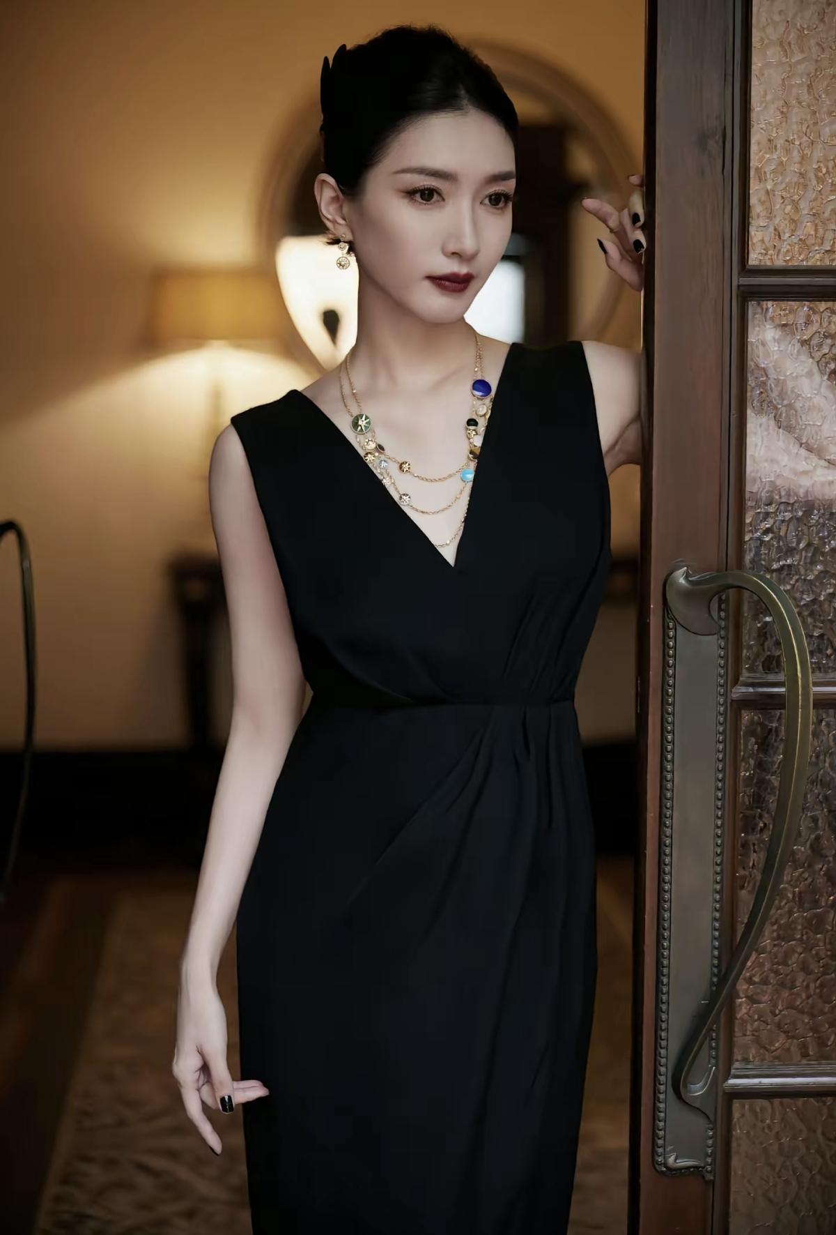 黑裙、红唇、彩色宝石项链,江疏影把复古氛围感直接焊在身上,慵懒又迷人[比心]无袖V领黑裙勾勒出完美曲线,江疏影的肩颈线条真的绝了,清冷又高级[赞]娱乐明星