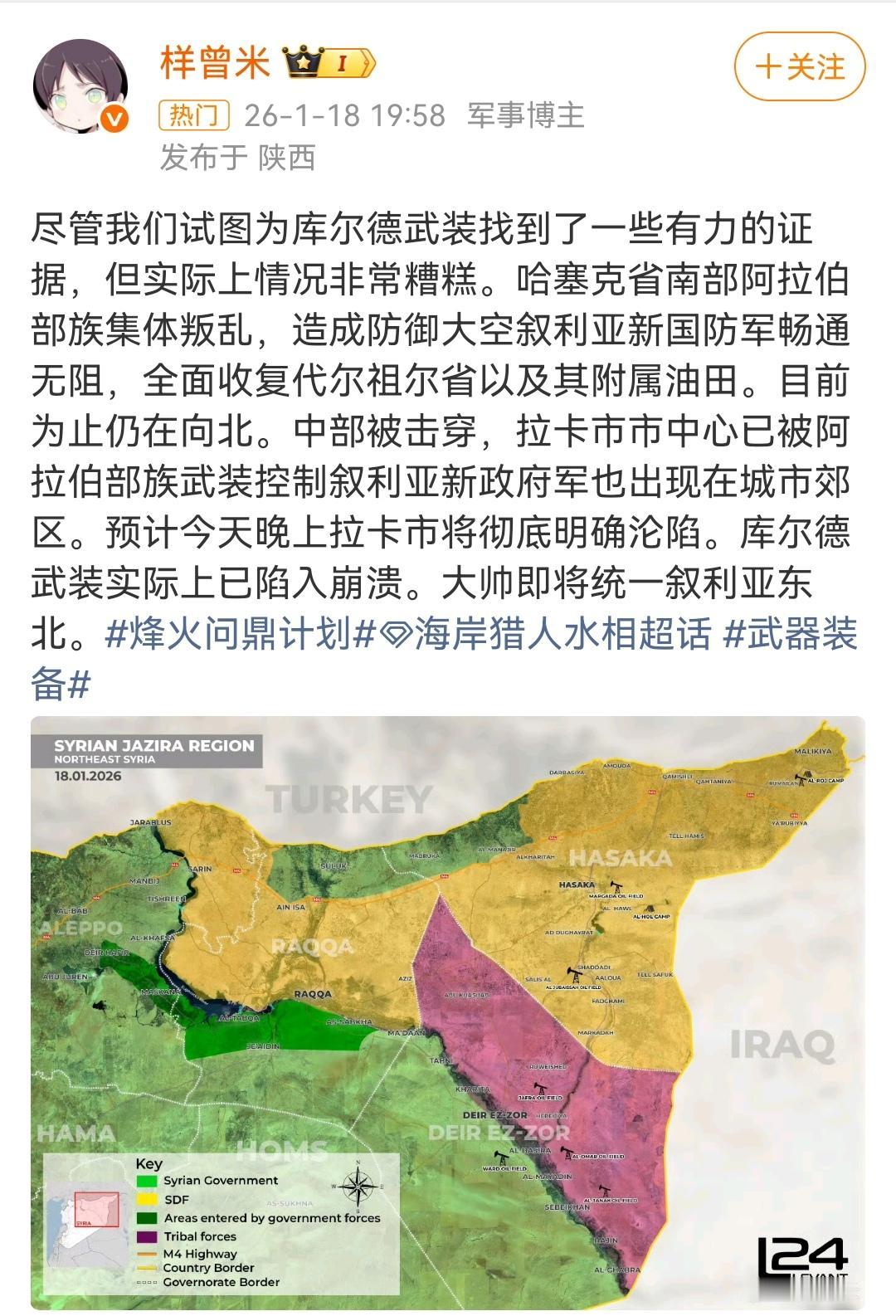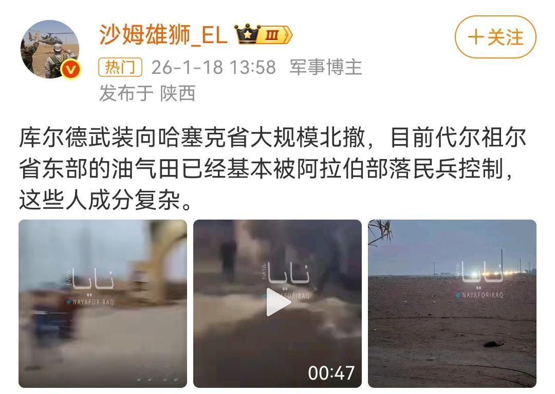 叙利亚库尔德人重蹈覆辙。 (如图所示)2017年伊拉克的库尔德人就占据了不少伊拉克油田,但在伊拉克政府军和盟友武装的进攻下惨败,伊中央政府重掌基尔库克石油资源,伊库尔德自治区的财政与独立诉求遭受重大打击。 2026年这一幕在叙利亚库尔德人身上重现,在叙利亚政府军的进攻下,内忧外患,把到手的油田拱手相让。 库尔德人记吃不记打,这建国大梦遥遥无期了。