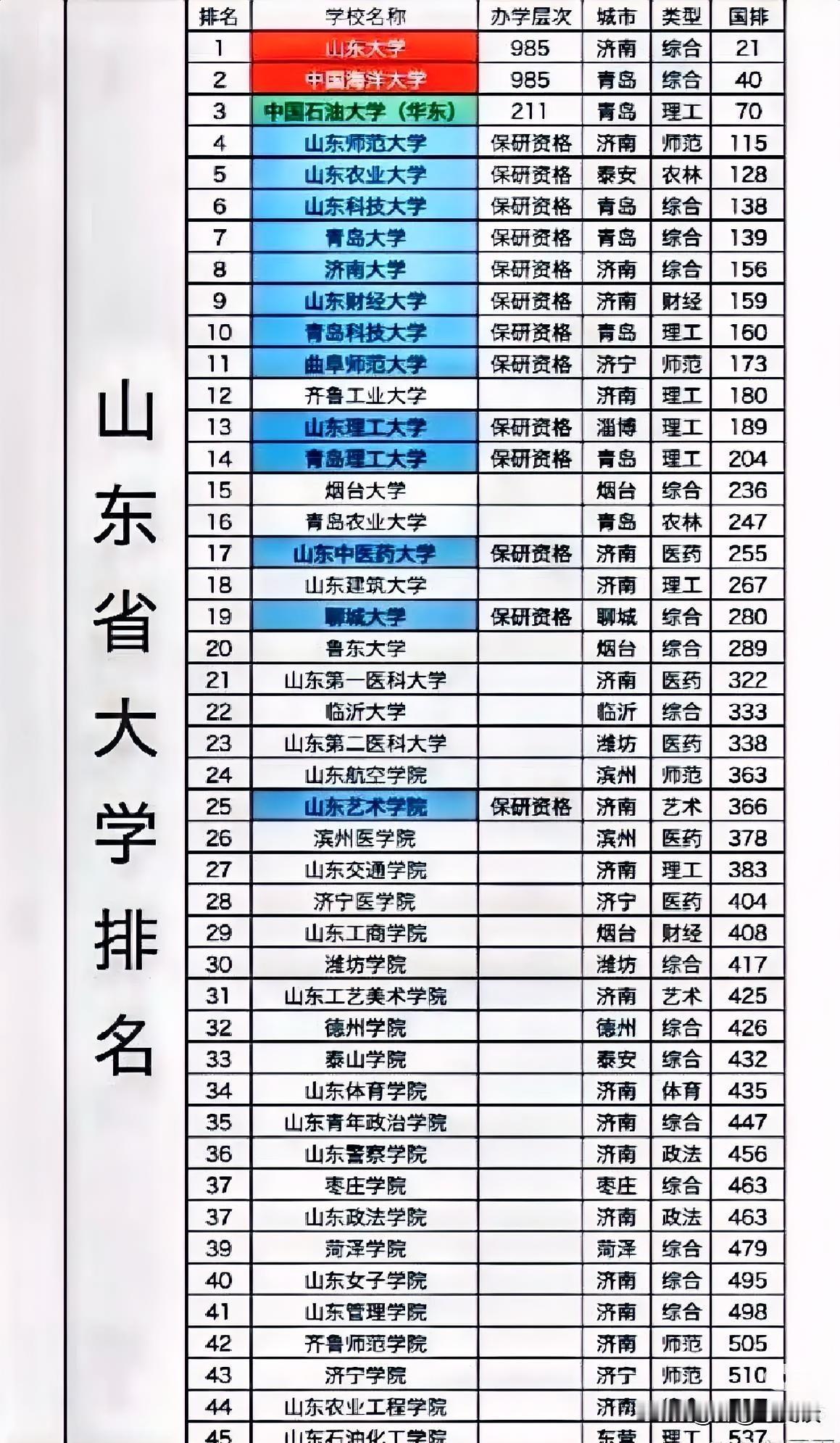 大洗牌!山东45所本科高校排行榜揭秘!一图概览,山东985高校,具有保研资格高校汇总合集。以地市命名的高校,是我们值得重点关注的高校;这类高校是各地重点支持,大力投资建设的重点大学。比如,青岛大学、烟台大学、济南大学、聊城大学等等。高考志愿填报参考指南,速速围观揭秘详细内容![点亮平安灯][点亮平安灯][烟花][烟花] 欢迎关注@叮咚云 将优先为粉丝职业规划指导,1对1咨询是付费服务,为你定制最适合的就业择业方案!欢迎留言交流讨论。[来看我][来看我] 免责声明:图片来自网络,仅供参考! 央国企招聘山东企业山东院校之最