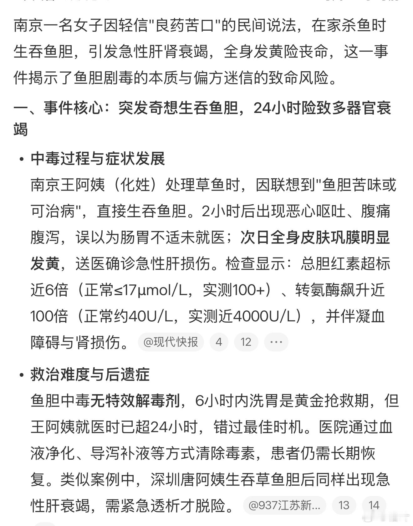女子在家杀鱼时拿起鱼胆就生吞 鱼胆中含有氢氰酸、水溶性鲤醇硫酸酯钠等多种毒素 ,其中毒性最大的是氢氰酸,其毒性比同剂量的砒霜还大。住几天ICU可比一条鱼贵多了