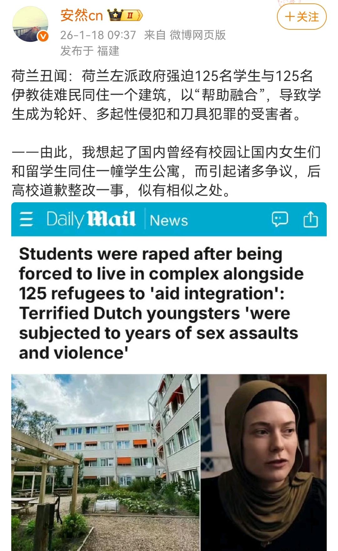 这是真有信仰的人吗? (图一,图二)荷兰政府挺有信仰的,要用强迫同居在一座建筑内学生们“帮助融合”的爱去感化同样也有信仰的某教徒难民,结果学生们遭难,难民们也成为加害者。 (图三,图四)国内也有不少这样的人,他们帮教不帮理。