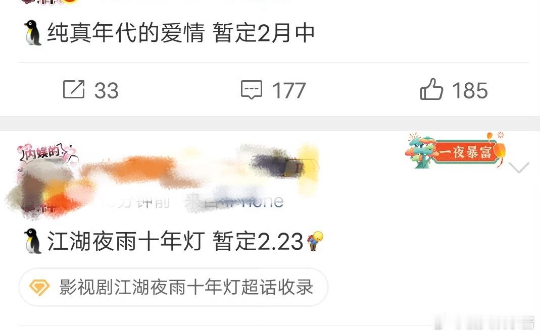 陈飞宇、孙千《纯真年代的爱情》和周翊然、包上恩《江湖夜雨十年灯》都在🐧新春档,你想看哪部
