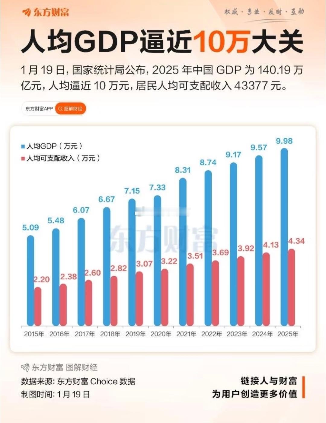 去年我国人均GDP逼近10万大关。