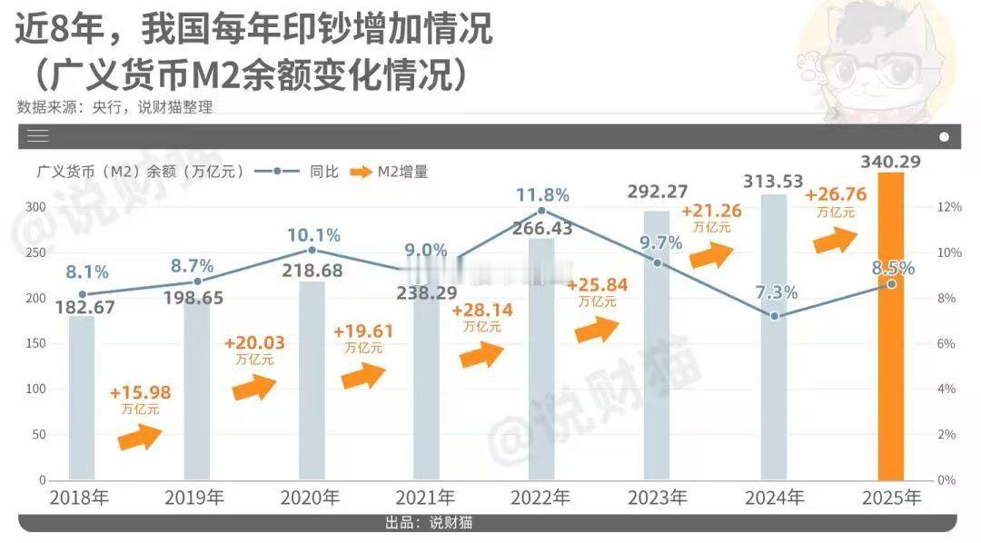 从去年到现在,股市涨,黄金涨,白银涨,印钞机持续发动,截至2025年底,M2余额达到340.29万亿。