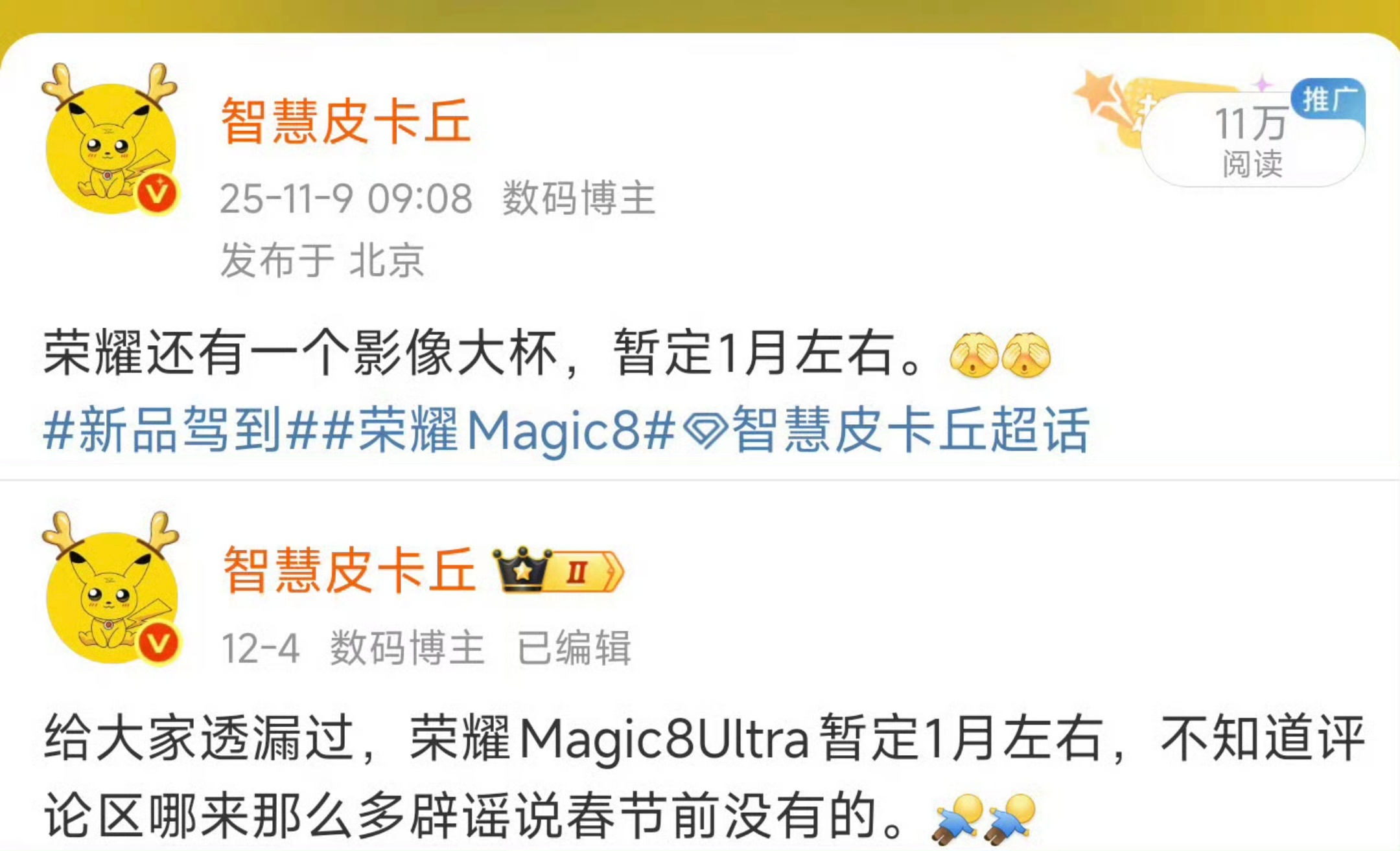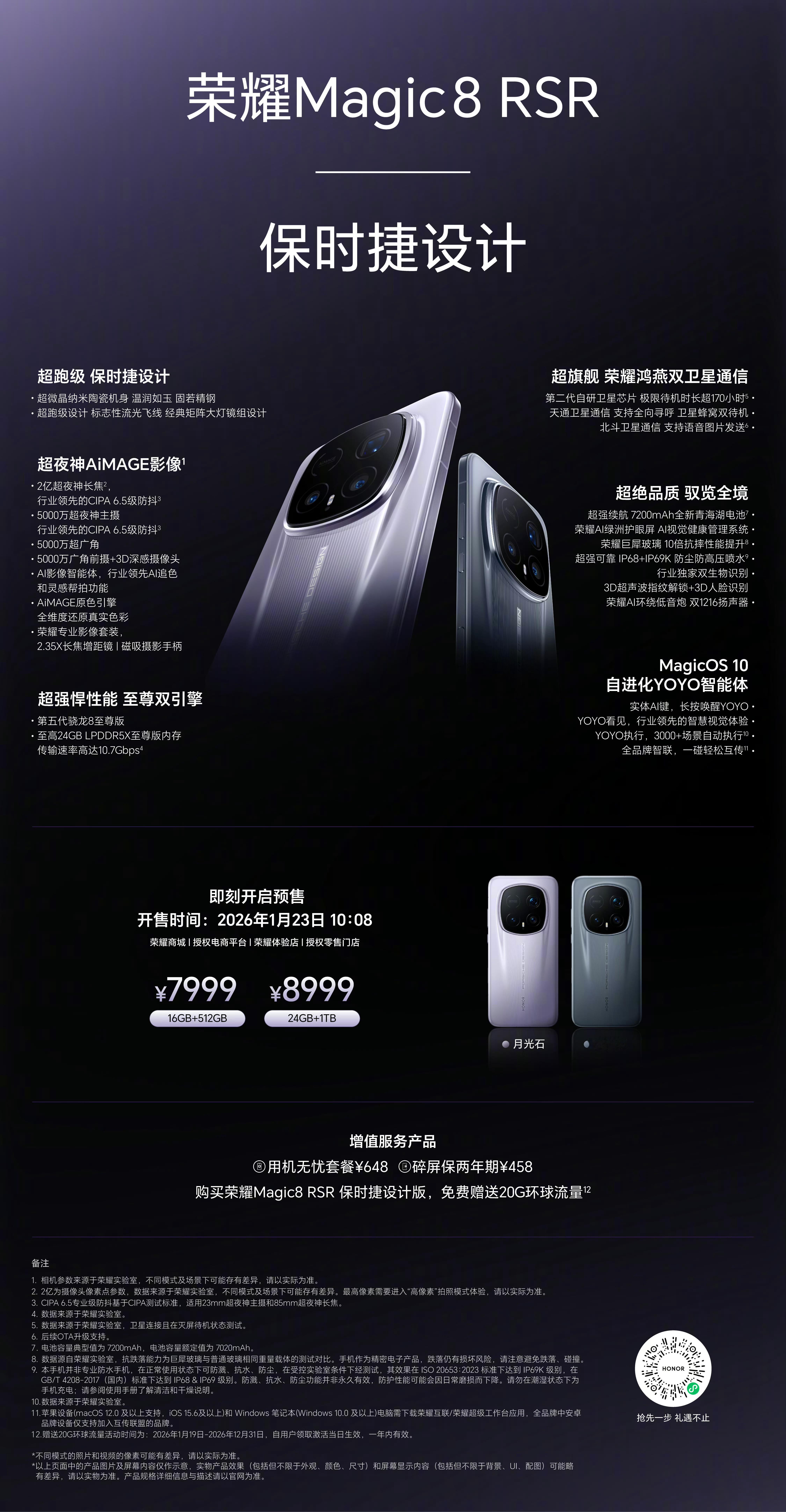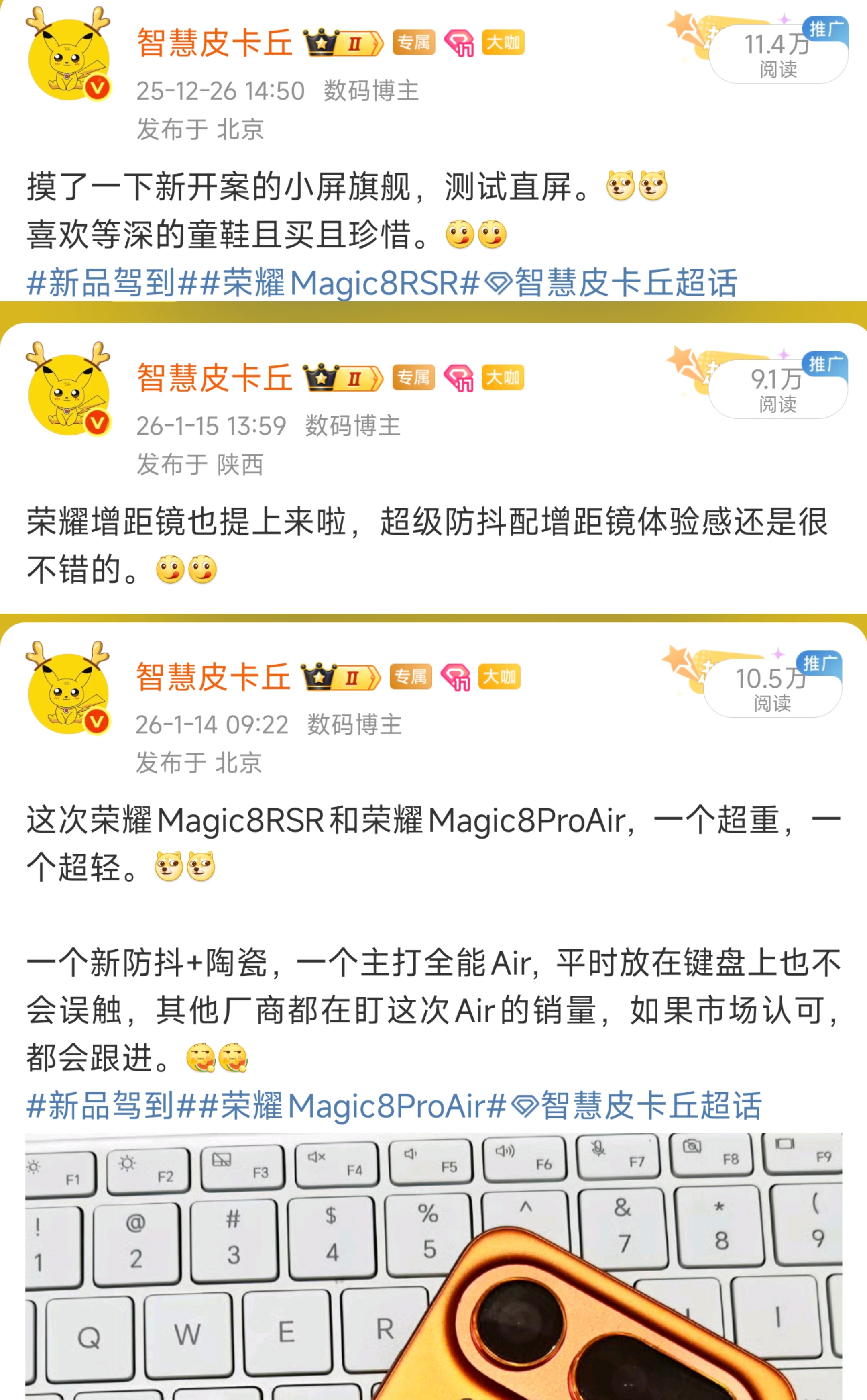 荣耀Magic8ProAir和荣耀Magic8RSR发布了,年前最后一款影像旗舰,大家觉得如何。荣耀Magic8ProAir,4999起。蝉翼架构,6.31 LTPO直屏+天玑9500+eSIM+超声波指纹+Ai按键。前置50MP+后置50MP 1/1.3+50MP超广+64MP 3.2X潜望长焦+变焦闪光灯。80W+50W+5500mAh。荣耀Magic8RSR保时捷,7999起。代号超夜神,6.71 LTPO等深+骁龙8EliteGen5+双3D+陶瓷后盖+Ai按键+双卫星通讯。前置50MP+后置50MP 1/1.3+50MP超广+200MP 3.7X潜望长焦。120W+80W+7200mAh。还有荣耀影像套装,1999元。荣耀Magic8RSR新品驾到智慧皮卡丘