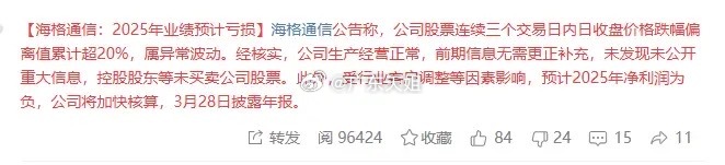 雪上加霜!海格通信3个一字跌停,盘后公告,2025年业绩预计亏损。今天收盘第三个一字跌停,跌停板上50.9亿封单。这太恐怖了,趁你病要你命!虽然这些妖股炒作跟业绩没什么关系,不但没关系,游资爆炒,还喜欢找业绩差的,涨潮期,拉升的时候忽视一切利空,但现在是退潮,放大利空,忽视利好。按照目前这种封单,肯定是有爆仓的了,那么再来两个跌停,直接腰斩。这一把,跟直接踩雷一个退市的杀伤力一样。这种巨大的杀伤力,会向其它高标传到,未来量化,游资,JG会更严。