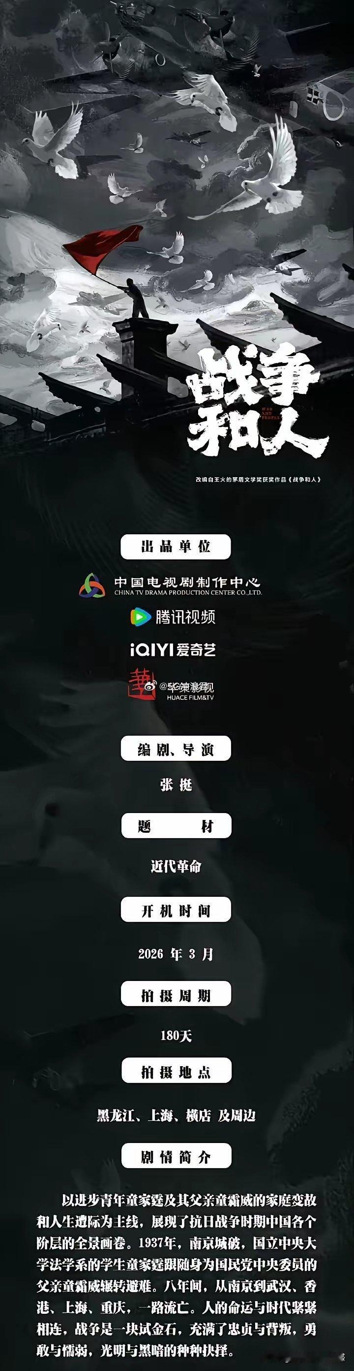 白敬亭新饼确定!是个大饼好饼!根据茅盾文学奖同名小说改编的60集电视剧《战争和人》3月开机,男主白敬亭!该剧由华策制作,编剧/导演:张挺,央视上星,网播腾讯、爱奇艺。剧情主要以进步青年童家霆及其父亲童霜威的家庭变故和人生遭际为主线,讲述了在战争中忠贞与背叛,勇敢与懦弱,光明与黑暗的种种抉择的故事。