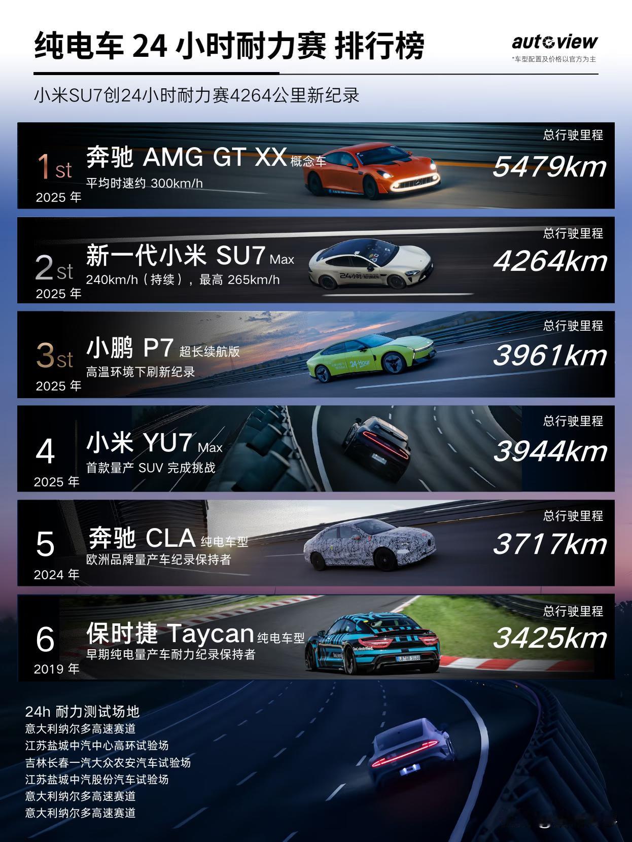 24小时耐力测试都有哪些纯电车测了? 首先,必须有奔驰车,一款名叫AMG GT XX概念车,平均时速为300公里/小时,跑出了5479公里的最佳成绩,不过很可惜,这是一款概念车; 然后,就是咱们的国产新能源汽车品牌小米,小米SU7 2026款,还未发布就率先秀起了肌肉,跑出了4264公里的第二名成绩; 第三名是谁呢?就是小鹏最新款的P7,跑出了3961公里的成绩; 第四名又是小米汽车,唯一一款纯电SUV,小米YU7用它惊人的三电技术跑出了3944公里的好成绩,我们知道SUV更重能耗更高,但是小米YU7的空气动力学设计为它优化了风阻,提高了一些续航,这是非常有用的; 第五名又是奔驰车,一款名叫CLA的纯电车跑出了3717公里的成绩; 最后一名的车型是保时捷的Taycan,3425公里的成绩。 可以说,敢去测试24小时耐力的车型,三电技术就已经很成熟了,最重要的是极速与散热的关系,这个关系处理好了,耐力测试才可以跑的更远! 图片来源:Auto View 奔驰eqc电车 纯电行驶里程 纯电高速焦虑 新能源电耗测试 新能源测试续航 新能源测试 纯电车续航测试