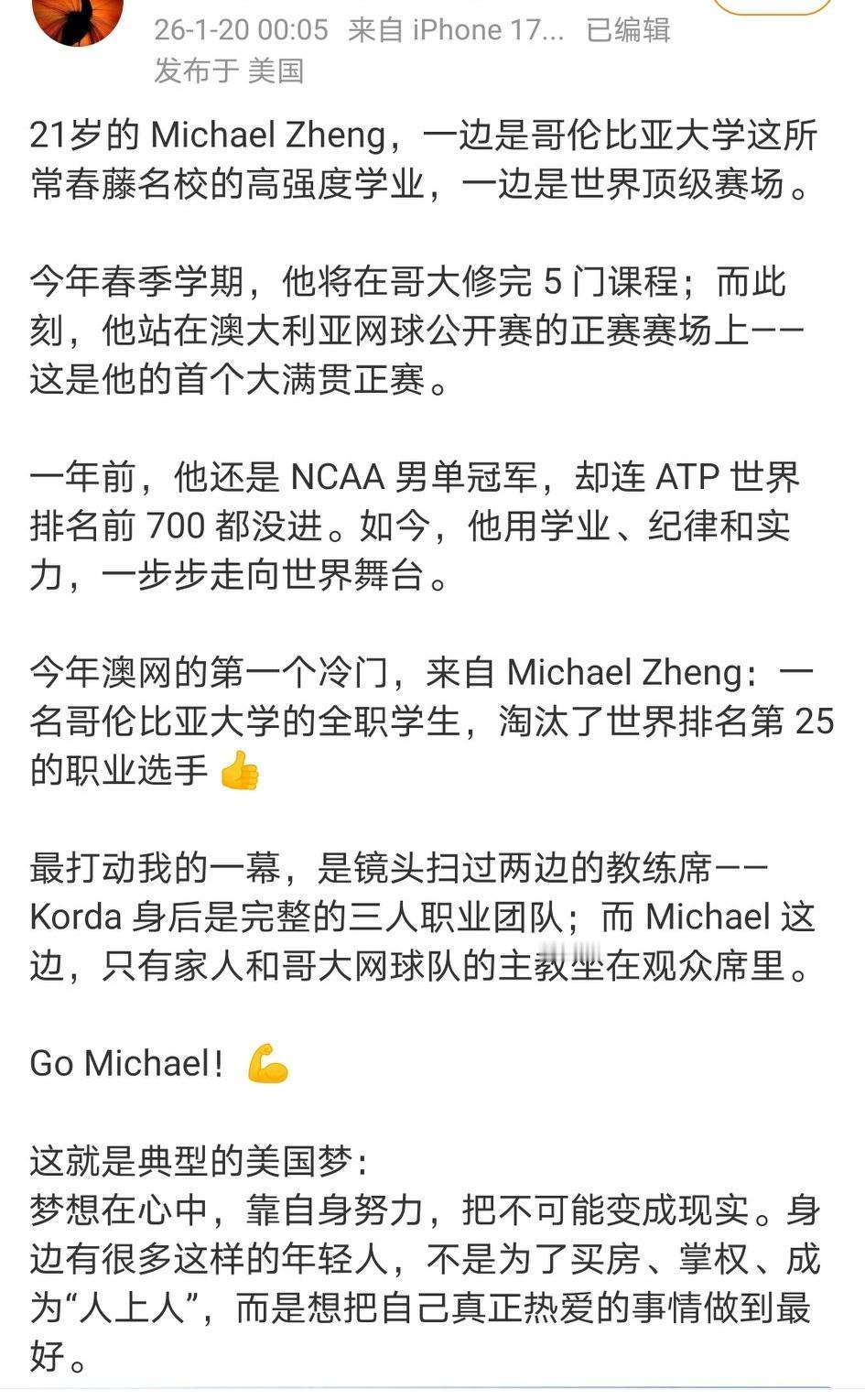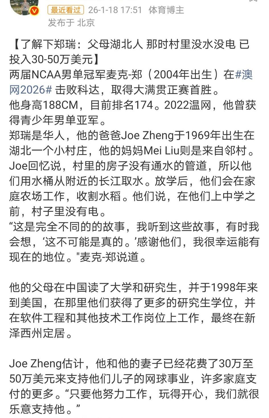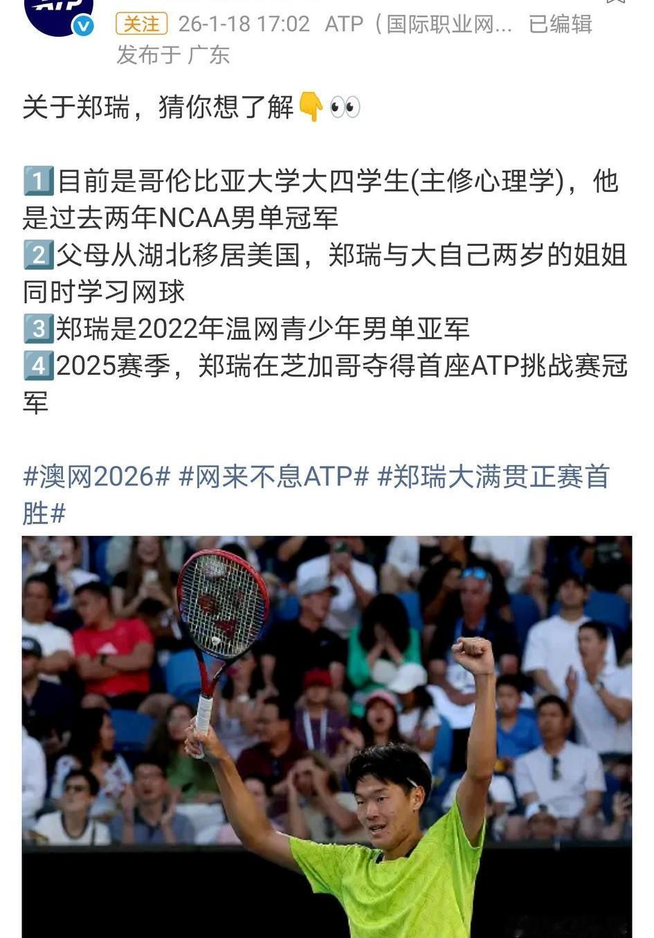 郑瑞6-4/6-4/3-6/6-7/6-3科达,打进澳网2026第二轮。下一轮对阵穆泰,即时排名来到175位。 美国华裔球员郑瑞,身高188,2004年出生。父母都是湖北十堰人。1998年,父母在30岁时移民美国。 他曾是2024和2025NCAA男单冠军。如今他在澳网拿到大满贯首胜。