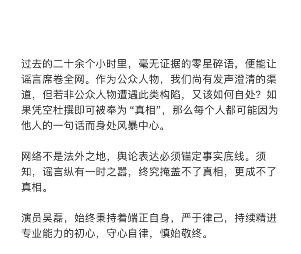 吴磊工作室这段话 看完心里挺感慨的不光只说“我被造谣了”,而是想到了更多普通人——如果没名没影响力的人遇到这种事,该怎么办?这种替别人着想的角度,真的很难得。现在网上经常一张截图、几句编造的话就能把人推上风口浪尖。特别是“如果凭空杜撰就是真相,那我们每个人都不安全”,这话特别实在。明明自己也算受害者,还能冷静地提醒大家注意这个问题,他的工作室能从这个角度看待问题,挺不容易的,用自己遇到的事,让大家看到更大的问题,这样的发声才真正有意义。他做得很好