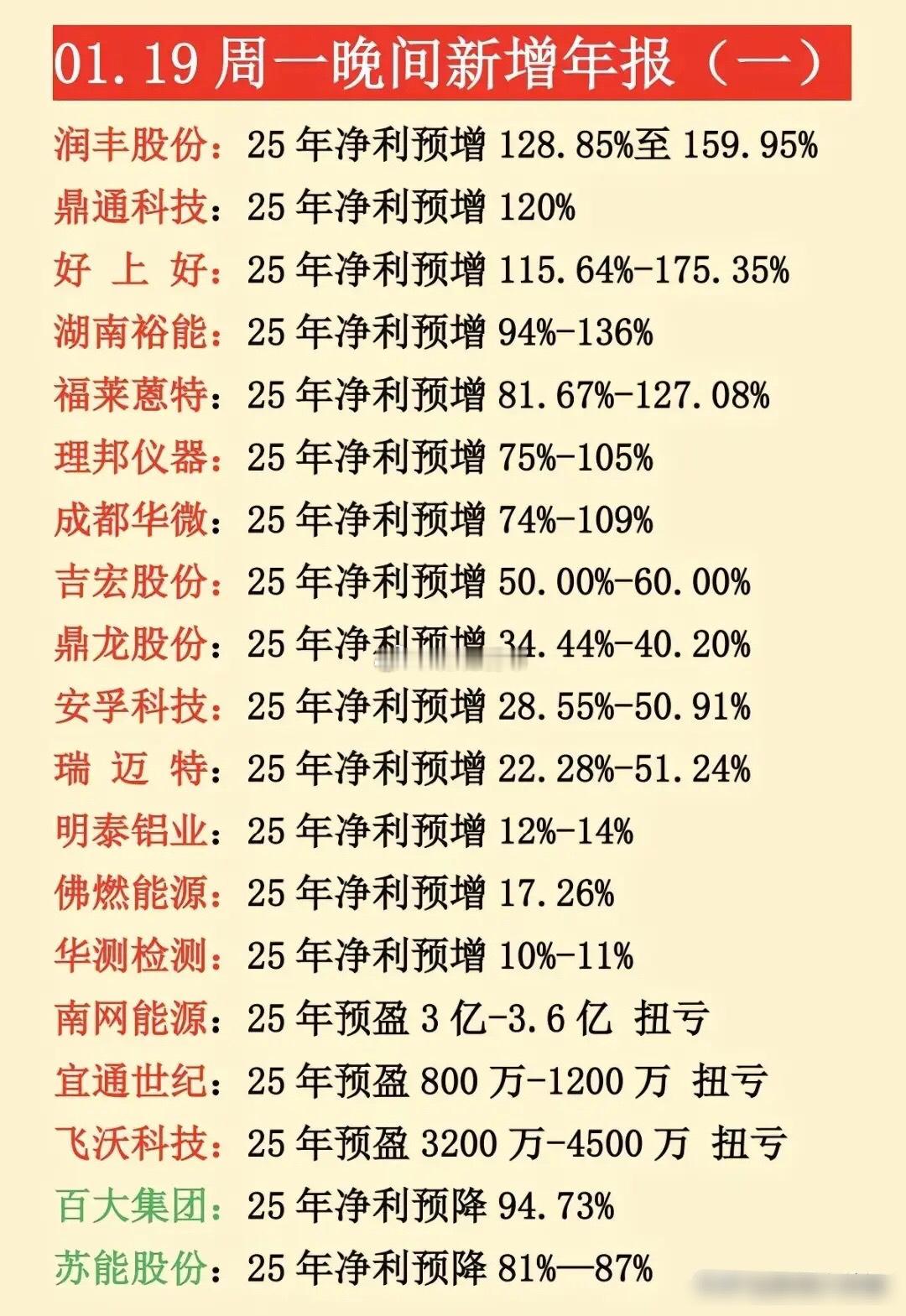 天雷滚滚,最新业绩风险来袭!1月19日晚间新增年报预告出炉,大批量的预减预亏来袭,这些公司要注意业绩风险了…~百大集团、保利发展、水井坊等企业净利润大幅下滑,保利发展预降近80%,水井坊预降71%;天合光能更是预亏65亿-75亿元,成为预亏“重灾区”,房地产、消费、光伏等板块压力凸显,市场需警惕相关标的业绩风险。年报预告业绩堪忧的科技龙头代表有中国长城、福日电子、电子城、大唐电信等等。理财有风险入市需谨慎。业绩数据仅供参考不能作为投资依据!