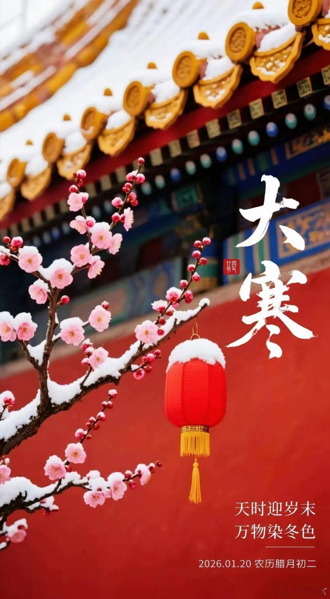 大寒1月20日大寒:寒尽春生,风雪迎新年,花开有期,愿一切美好如期而至,大寒安康!大寒,是我国传统的二十四节气之一,也是冬季的最后一个节气,是一年节气的终点,也是下一个四季轮回的起点,以风雪为礼,来一场隆重的告别仪式,期待着下一个繁花似锦序章拉开。大寒也是一年当中最冷的时候,大家要注意防风保暖,多穿衣服,多食热性食物,增添体内的阳气,平安健康过冬!今日大寒,祝愿大家平安喜乐,好运相伴,大寒安康!