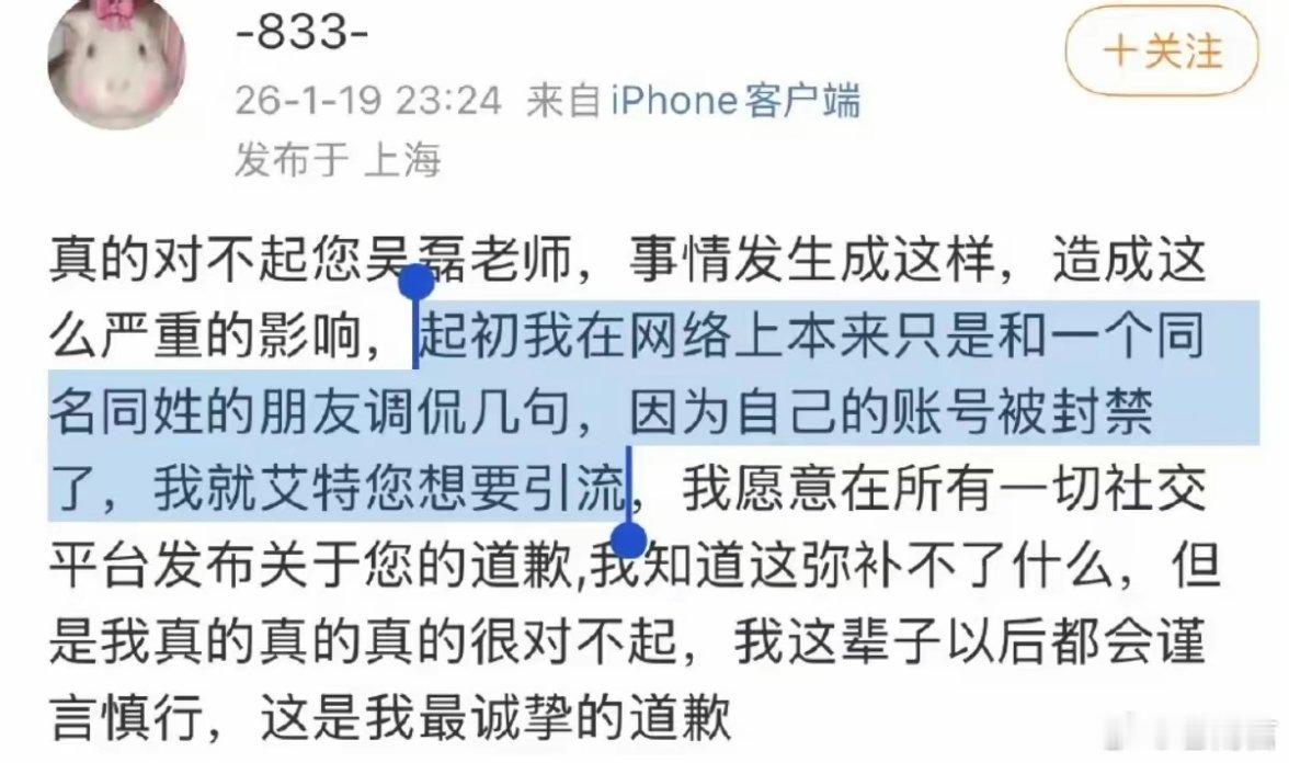 白珊珊向吴磊道歉面对吴磊工作室的强硬态度,白珊珊公开道歉,并承认自己为了流量,捏造的子虚乌有…很多人支持,吴磊告到底,网络不是法外之地,白珊珊的行为给吴磊带来的麻烦,以及名誉损失,更不是“对不起”能够轻飘飘解决的!