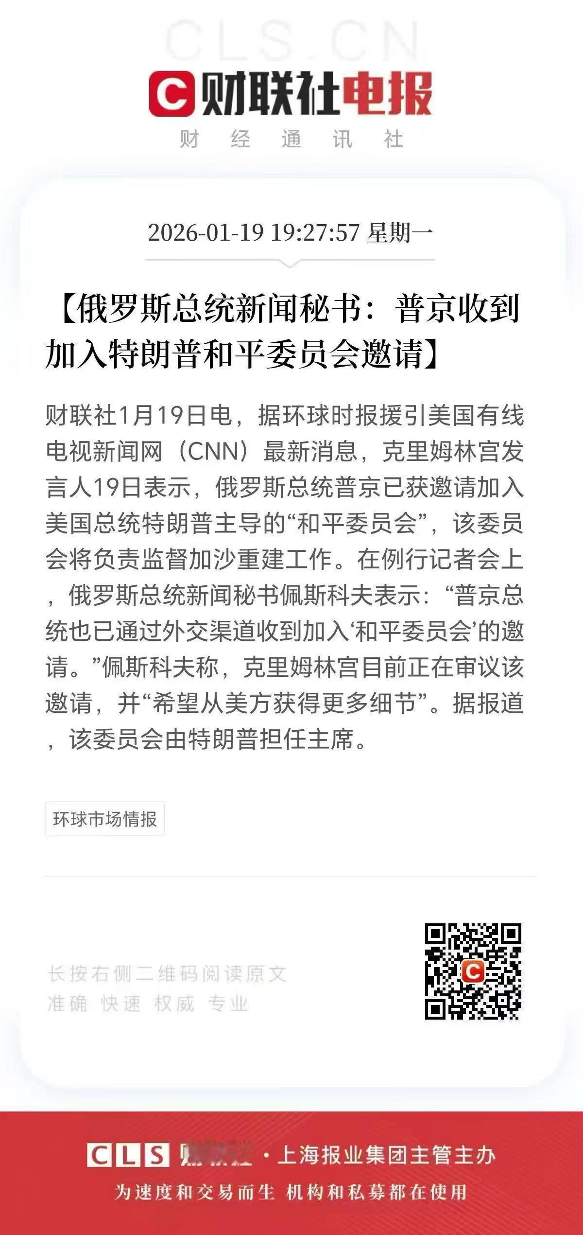 普京被美国邀请加入和平委员会【俄罗斯总统新闻秘书:普京收到加入特朗普和平委员会邀请】特朗普凭借美国经济、军事、科技无与伦比的实力,肆无忌惮地频繁制造“世纪笑话”,竟邀请正在侵略邻国的俄罗斯加入所谓的“和平委员会”,真是令人不齿!特朗普开价10亿卖委员会永久席位将正发动战争的一方封为“和平使者”,这是对国际公义的彻底羞辱。此举毫不掩饰地服务于地缘私利,将严肃的国际事务异化为一场漠视规则的私人交易,本质是强权政治的终极体现,注定是又一场“闹剧”。马克龙拒绝特朗普邀请烽火问鼎计划