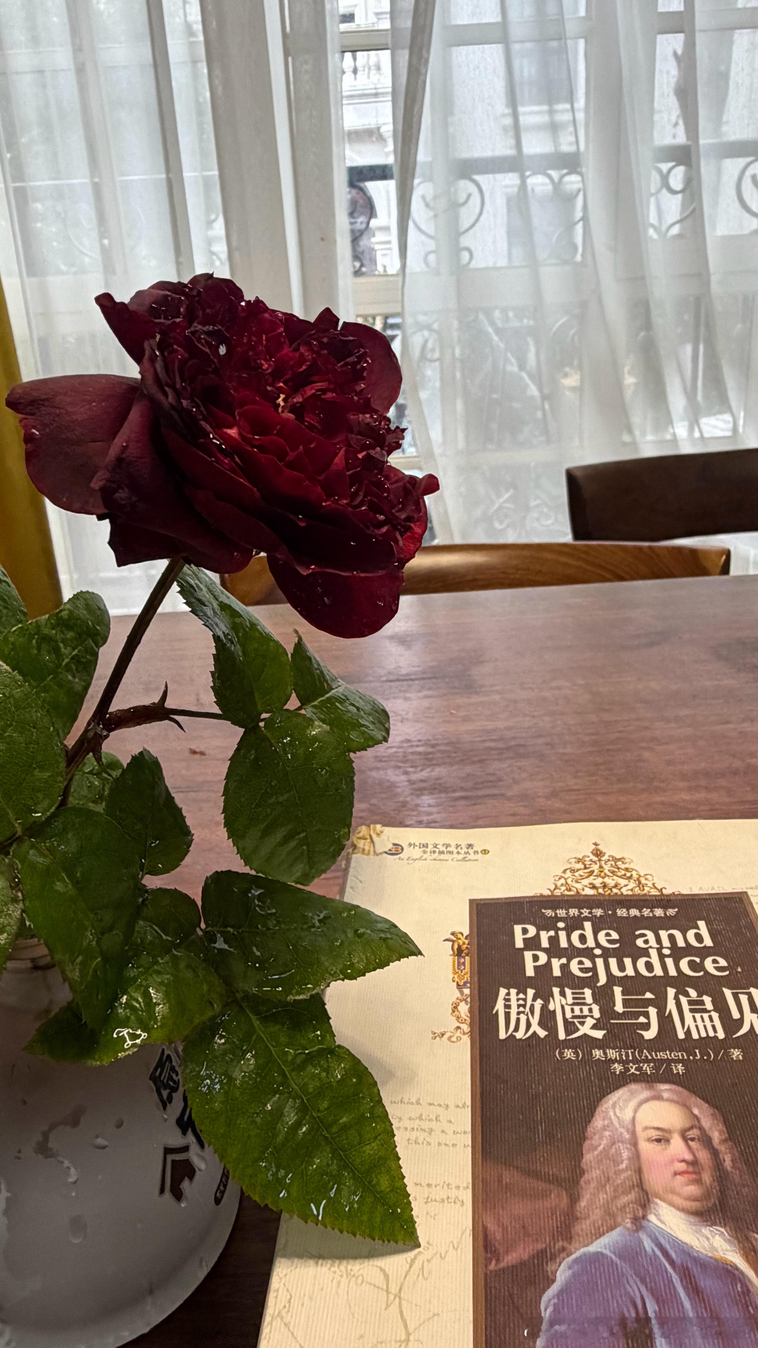 上海大雪。在院子里剪了一朵月季,天冷,开出了很罕见的黝黑的红。这种月季恰好叫“达西先生”,这会儿它真的太名副其实了。我和某人的日常