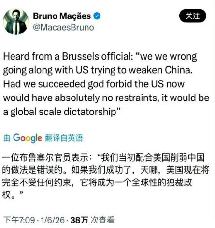 来自比利时的官员说了一句大实话,还好当时对中国网开一面,要不然现在真的没人能牵制住美国了。   其实他这句话说的有一定道理,现在美国可以说肆无忌惮了,好像整个西半球都成了他家一样,想要格陵兰岛就要格陵兰岛,想要加拿大就想要加拿大。   拉丁美洲的国家主权也根本不放在眼里,说抓委内瑞拉的总统就抓,说要威胁哥伦比亚就威胁,还要对古巴不客气,真的是神气极了。   现在能不受美国控制的也就剩下俄罗斯跟中国了,本来以为欧洲也有自己的话语权,但是看见格陵兰岛后才发现现在的欧洲早就成了美国的附属国。   所以现在部分欧洲人才会说幸好有中国的存在,要不然整个世界真成了美国的天下了。   不知道大家有什么看法,评论区聊聊。
