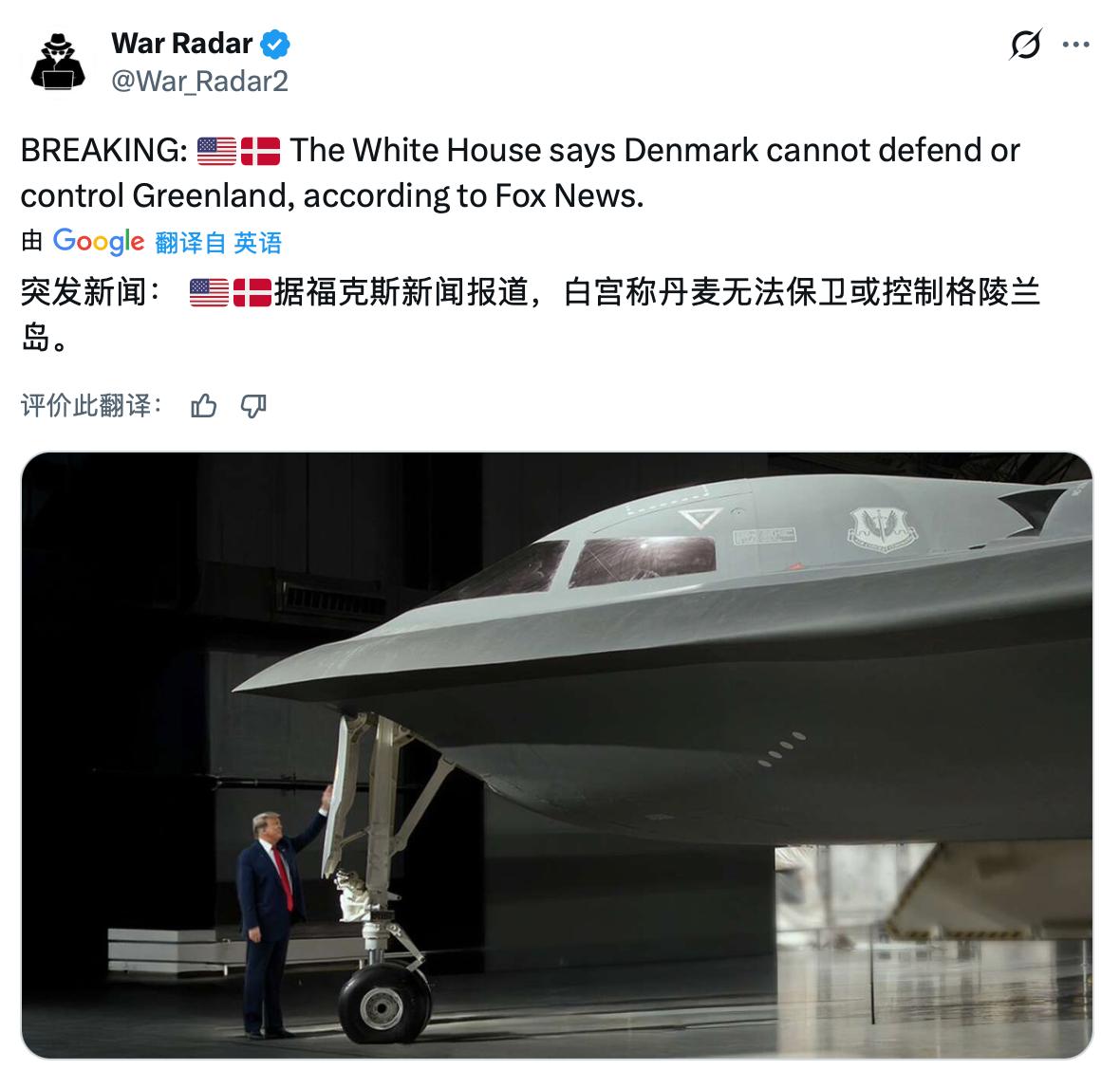 据福克斯新闻报道,白宫称丹麦无法保卫或控制格陵兰岛。 白宫顾问斯蒂芬•米勒在最近的一次采访中表示,丹麦无法保卫或控制格陵兰岛,声称它未能通过领土控制的基本测试。 这与特朗普总统以安全担忧,为由推动美国获取格陵兰岛的主张相一致。 丹麦和格陵兰岛的官员,则驳斥了这些说法。 别说,这个配图确实很符合特朗普风格。